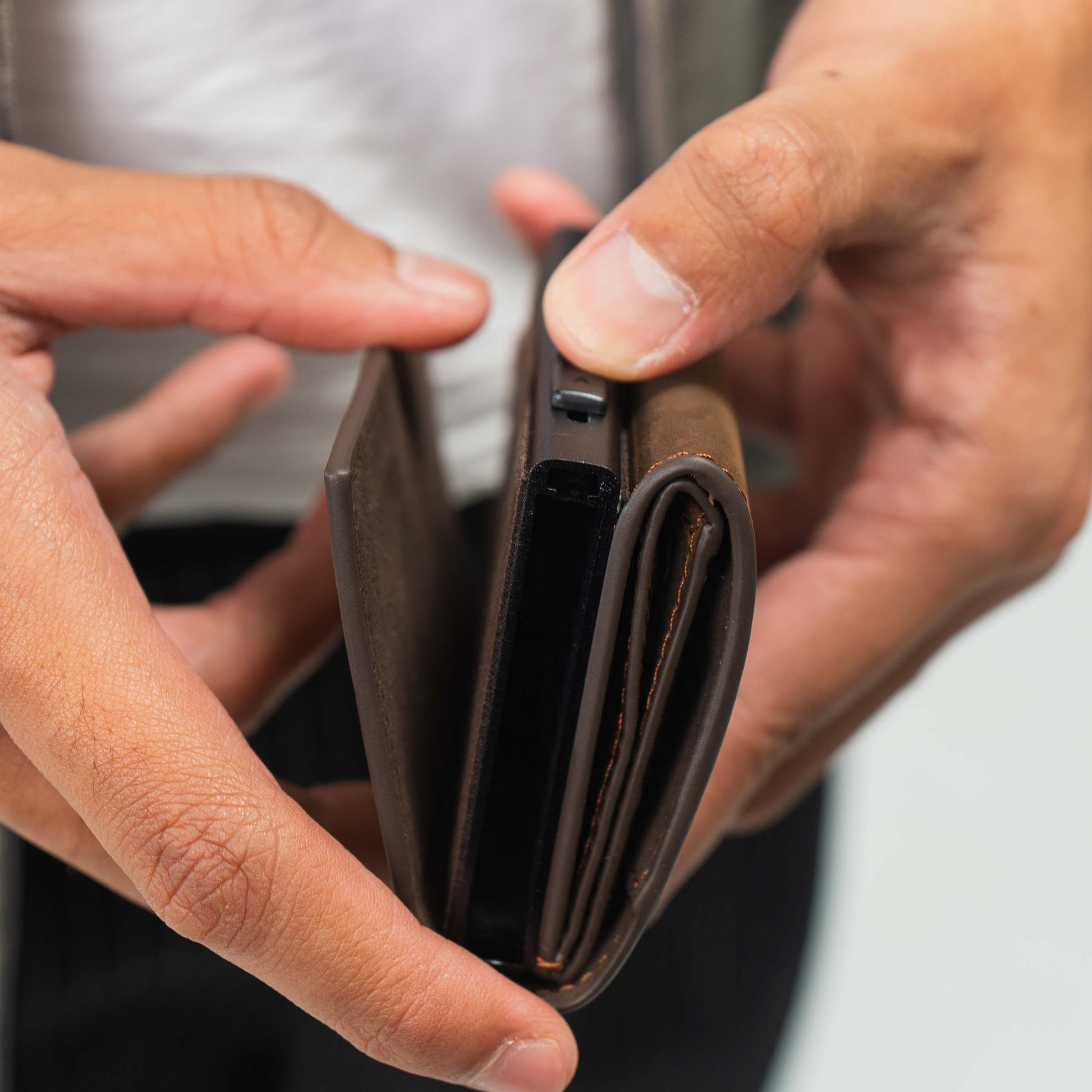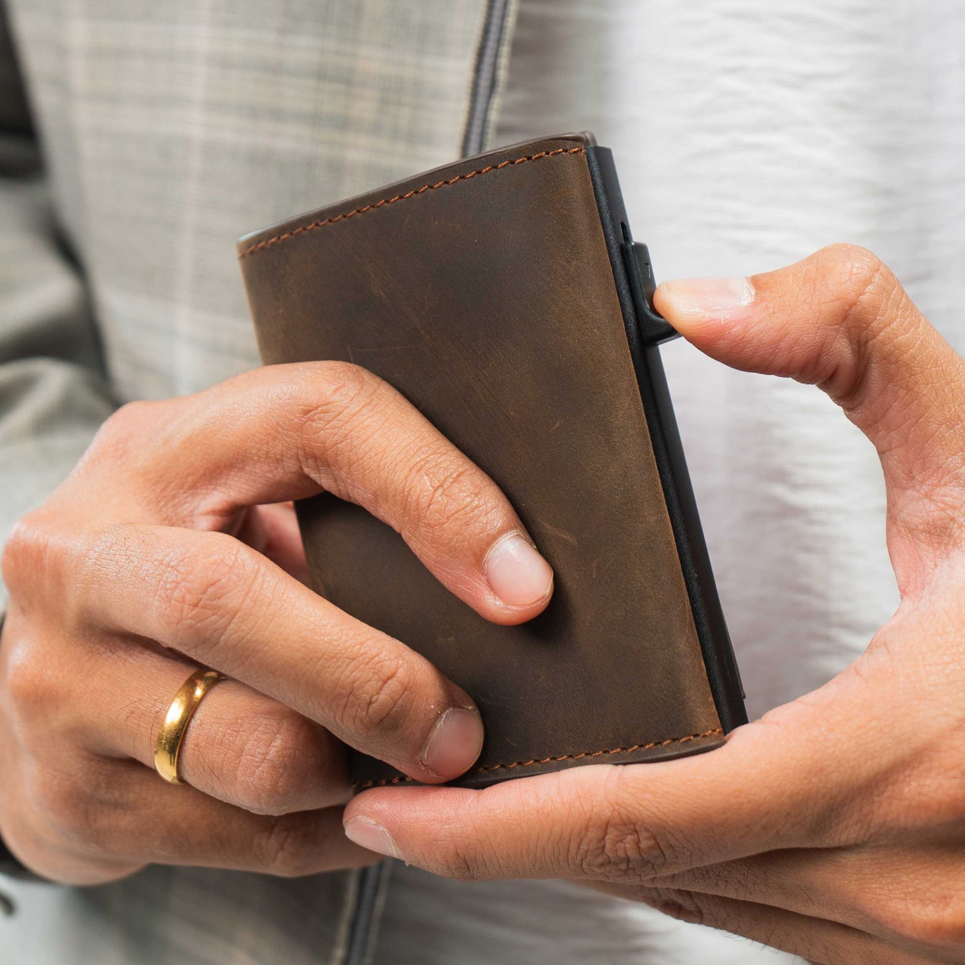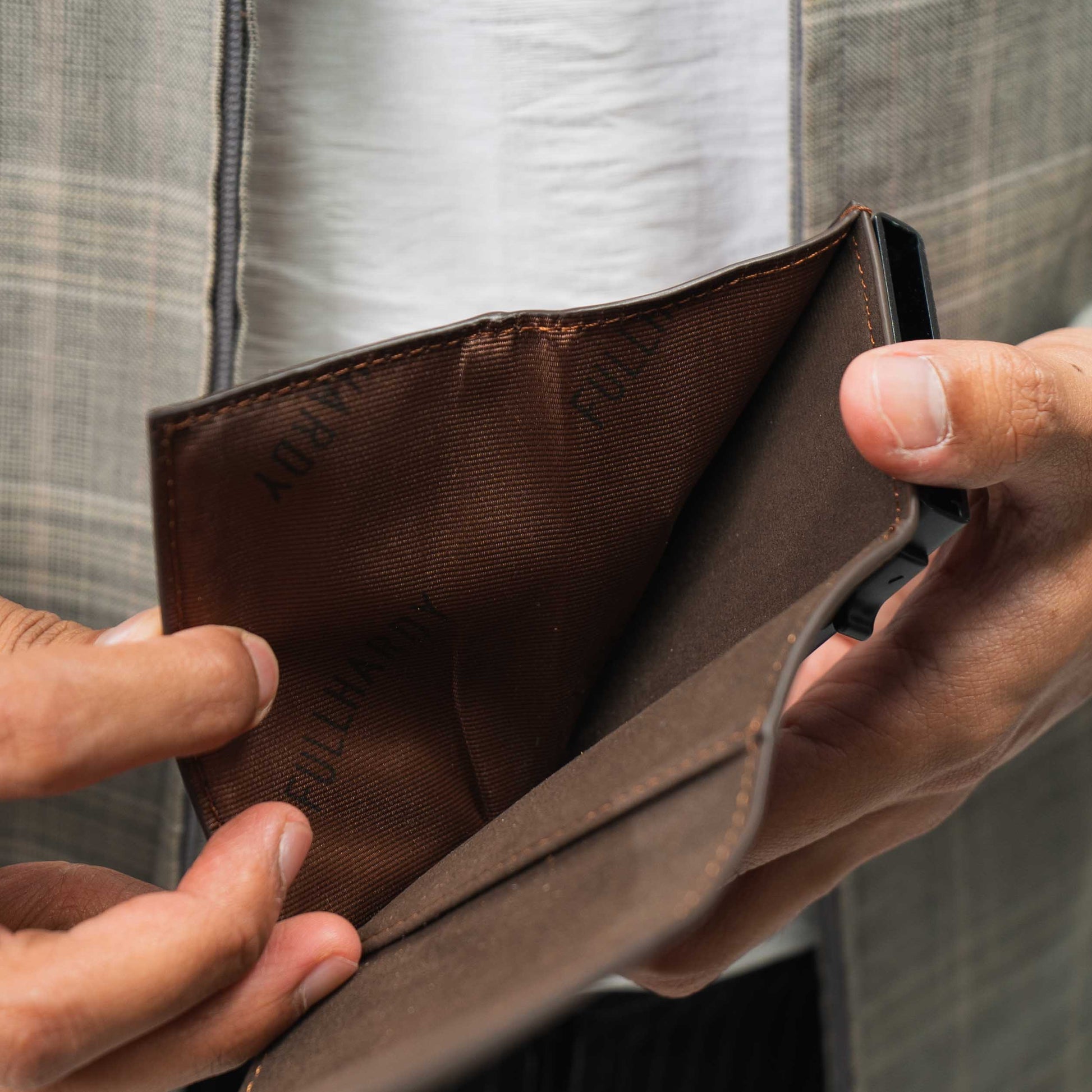 Berbahan kulit sapi berkualitas, dirancang fokus untuk penyimpanan kartu yang efisien.