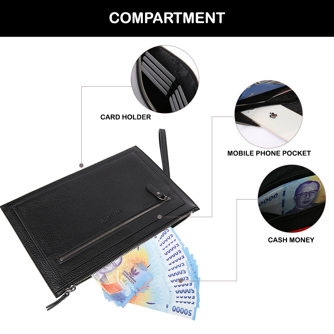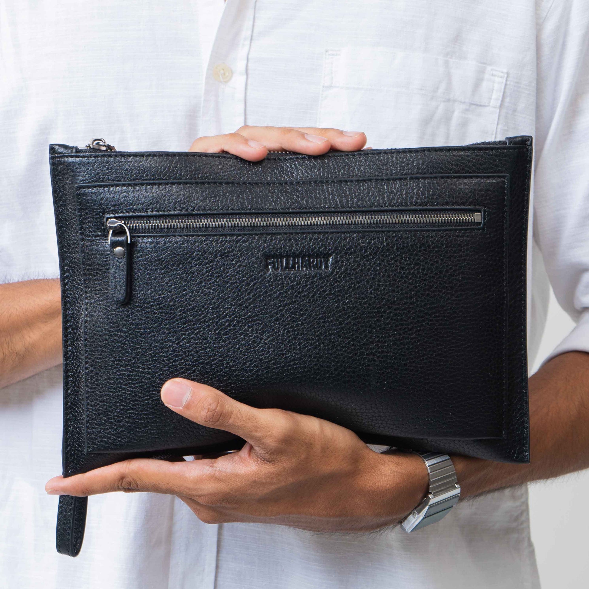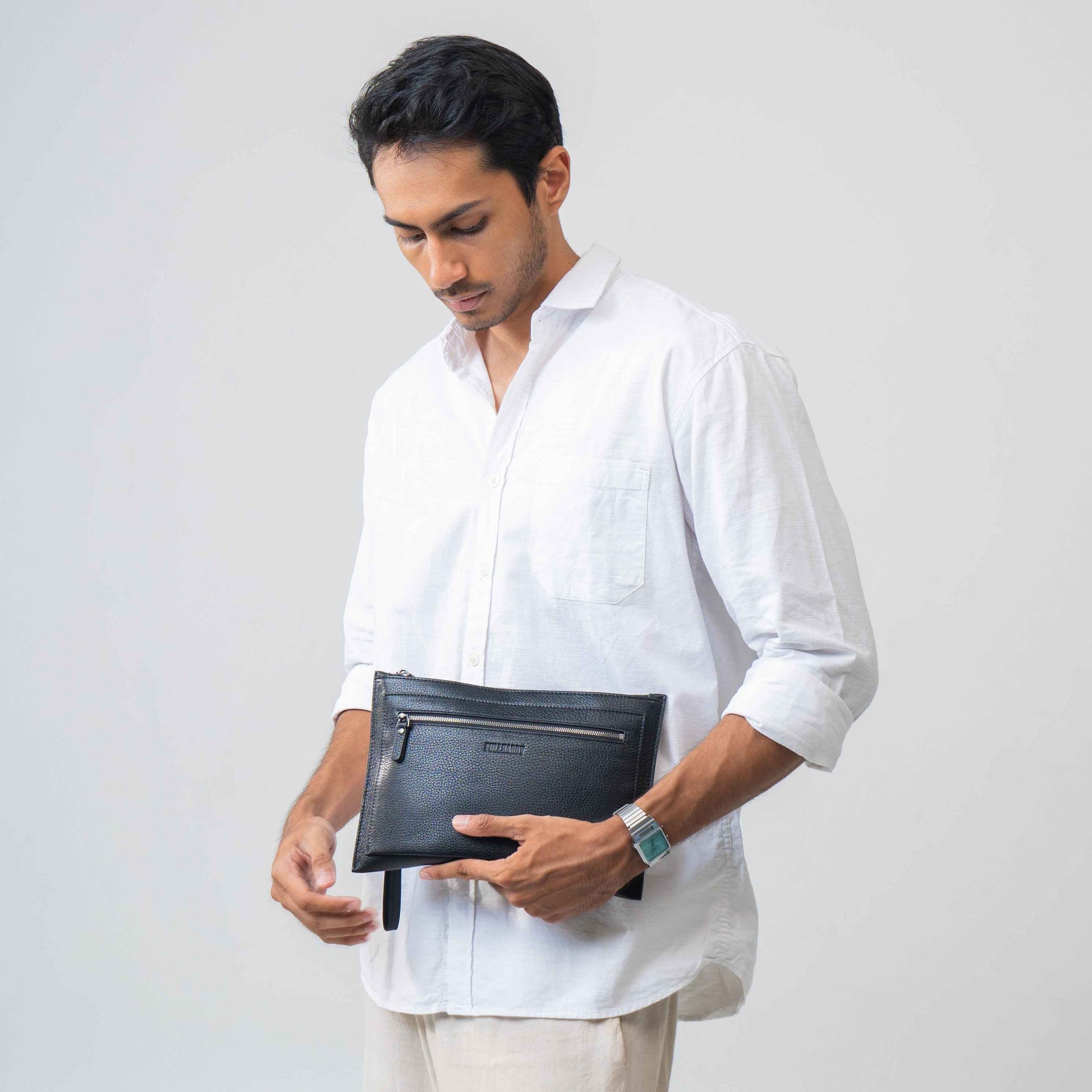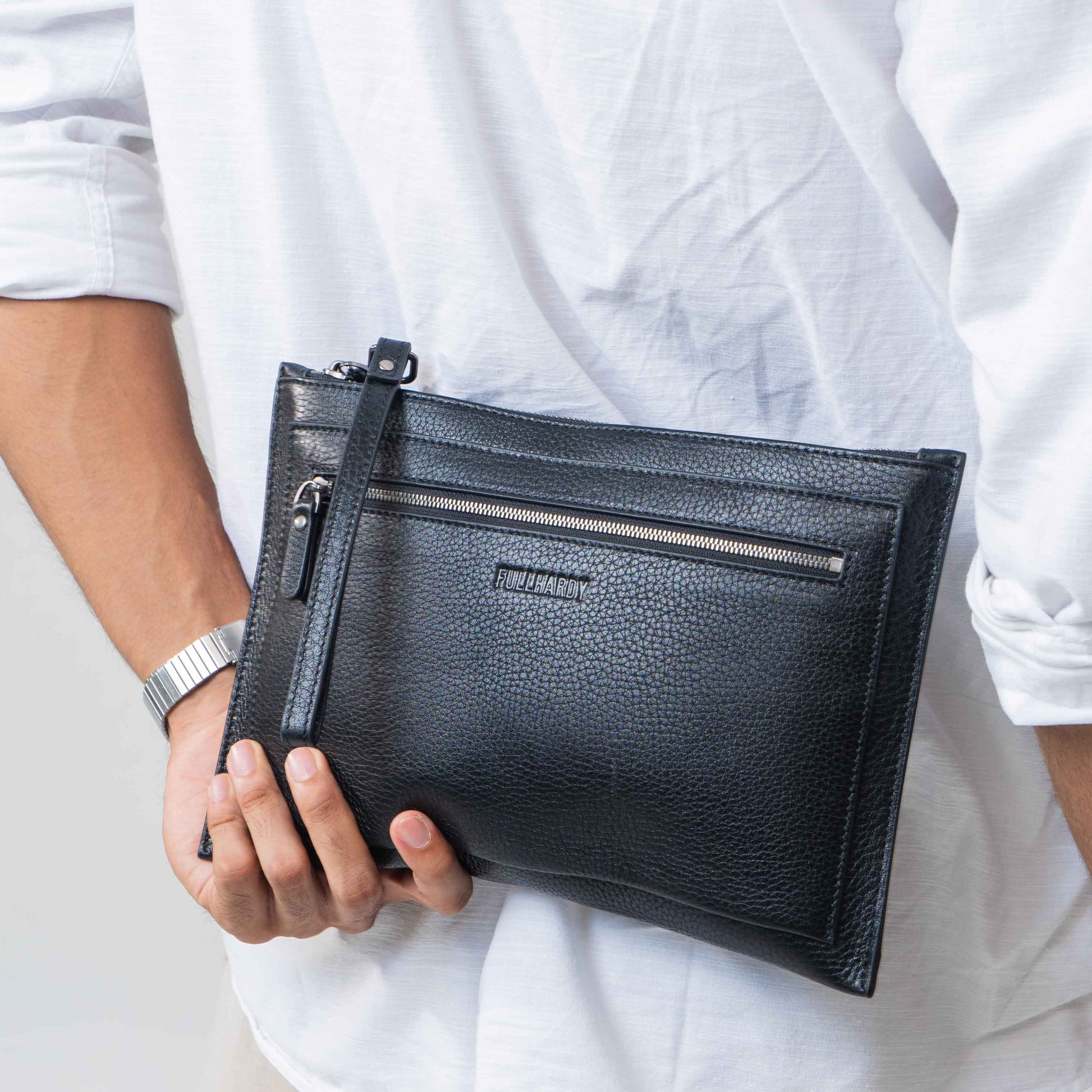 Hitam elegan dan berkelas, terbuat dari material kulit dengan tekstur halus namun tetap memberikan kesan tegas dan maskulin. Desainnya minimalis namun fungsional, dengan satu kantong ritsleting di bagian depan yang memberikan akses cepat. Terdapat juga tali kecil di sudut kiri, memungkinkan untuk digenggam atau diselipkan di pergelangan tangan dengan lebih nyaman. cocok untuk pria yang ingin tampil stylish tanpa perlu membawa terlalu banyak barang, baik untuk acara formal maupun kasual.