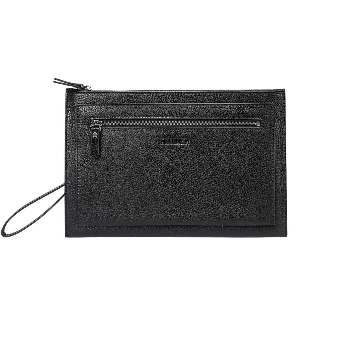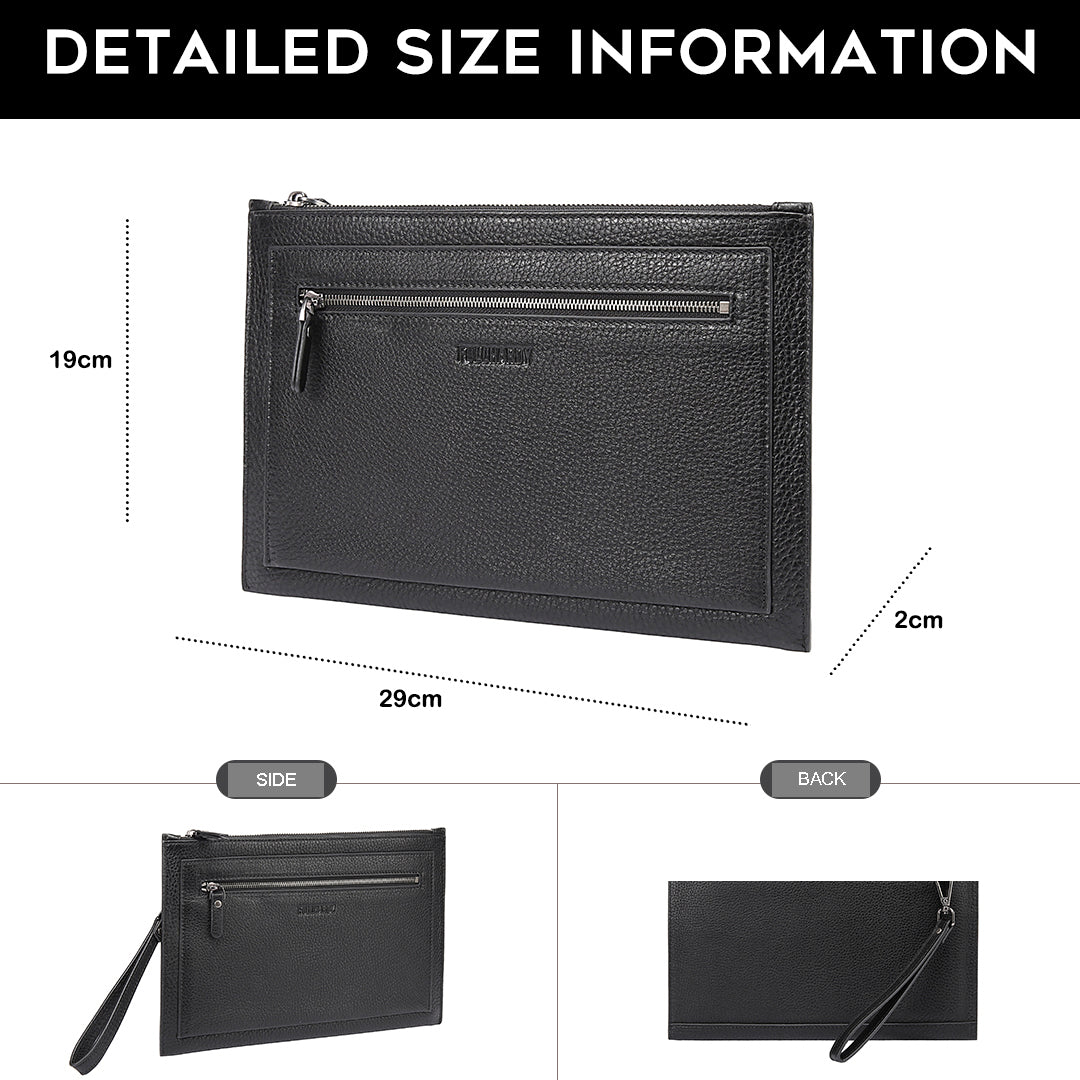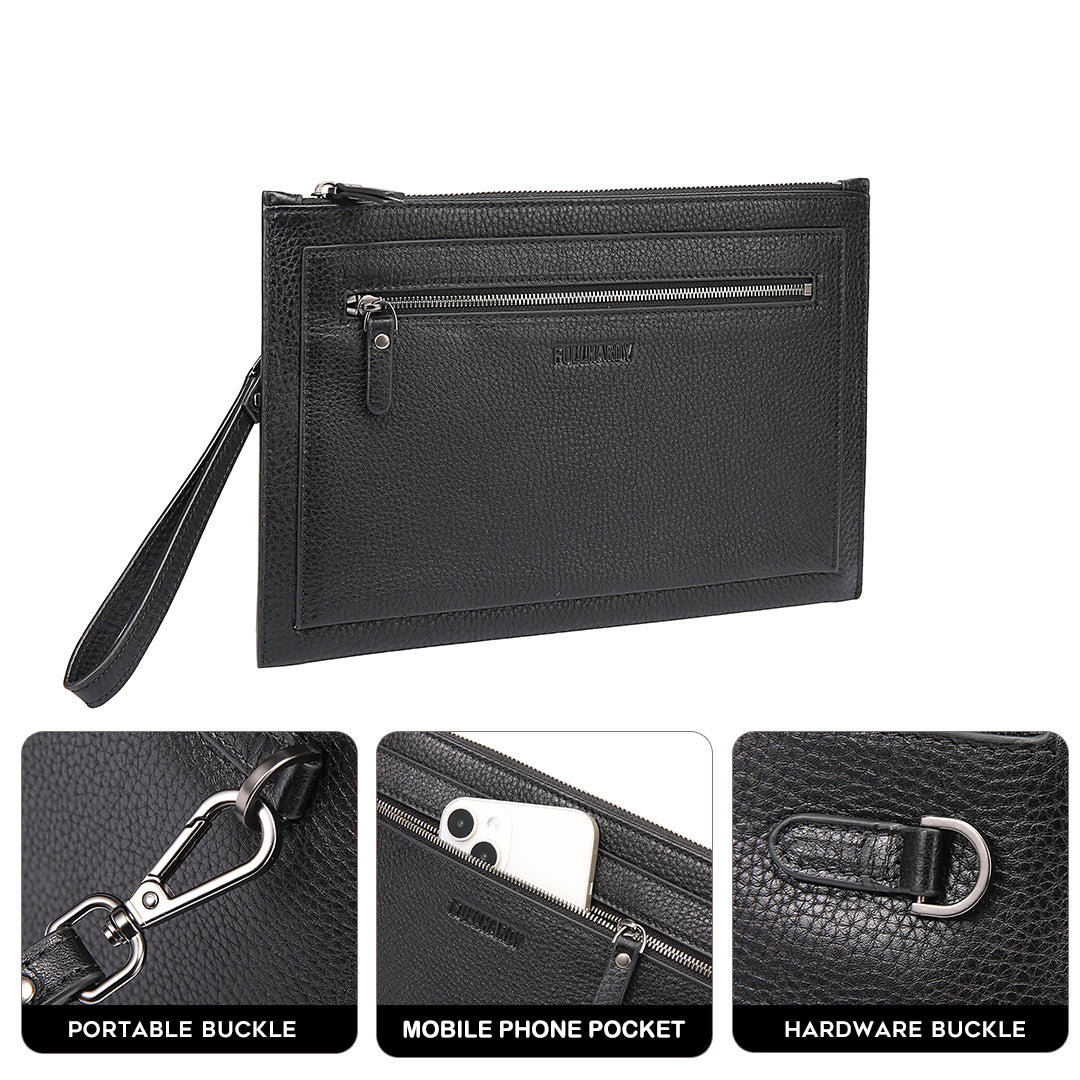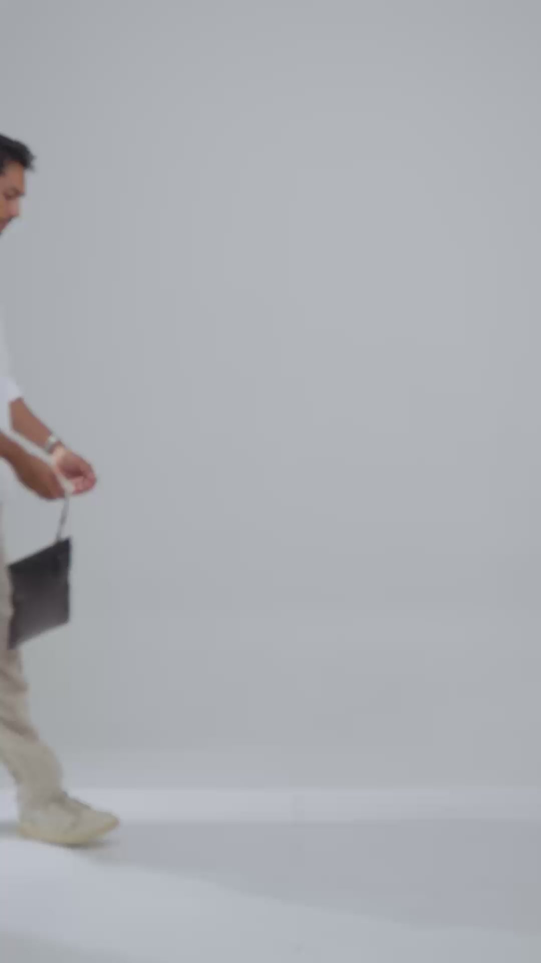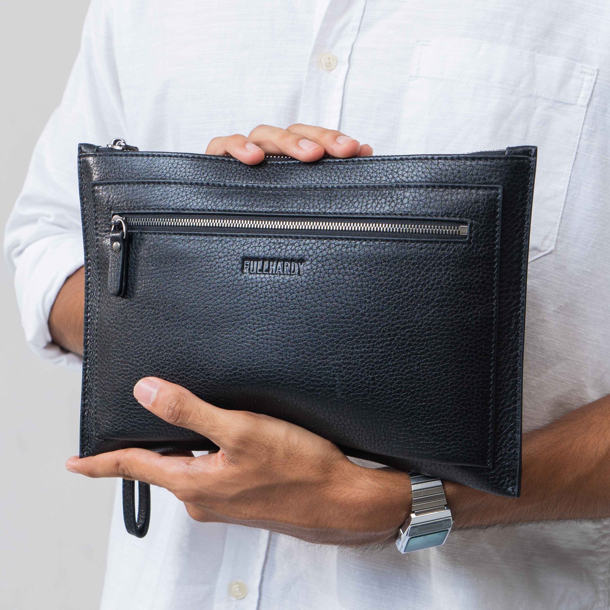 Hitam elegan dan berkelas, terbuat dari material kulit dengan tekstur halus namun tetap memberikan kesan tegas dan maskulin. Desainnya minimalis namun fungsional, dengan satu kantong ritsleting di bagian depan yang memberikan akses cepat. Terdapat juga tali kecil di sudut kiri, memungkinkan untuk digenggam atau diselipkan di pergelangan tangan dengan lebih nyaman. cocok untuk pria yang ingin tampil stylish tanpa perlu membawa terlalu banyak barang, baik untuk acara formal maupun kasual.
