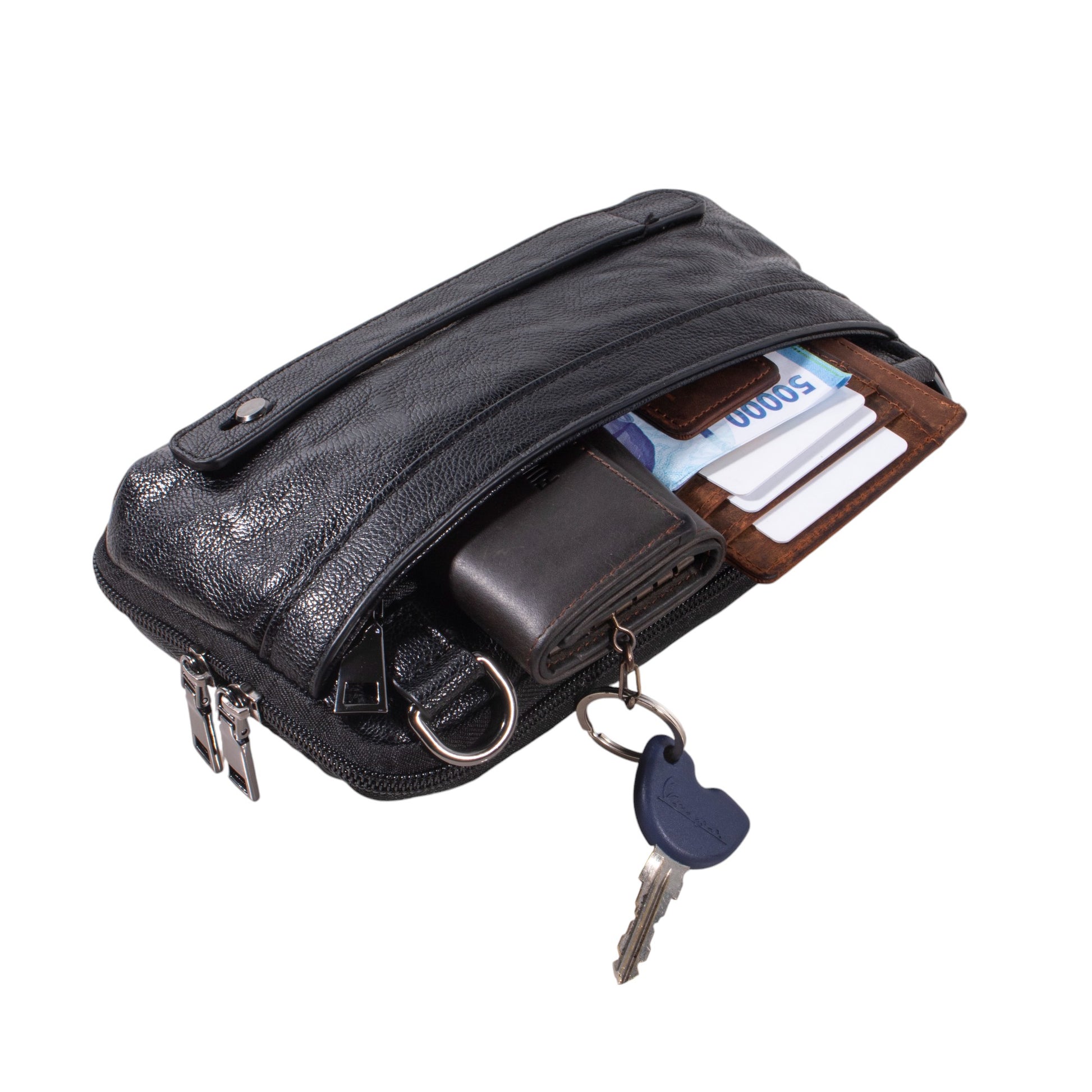 Exterior : 2 Zip Pocket,1 Back Zip Pocket, Handle Leather Strap, Adjustable Shoulder Strap