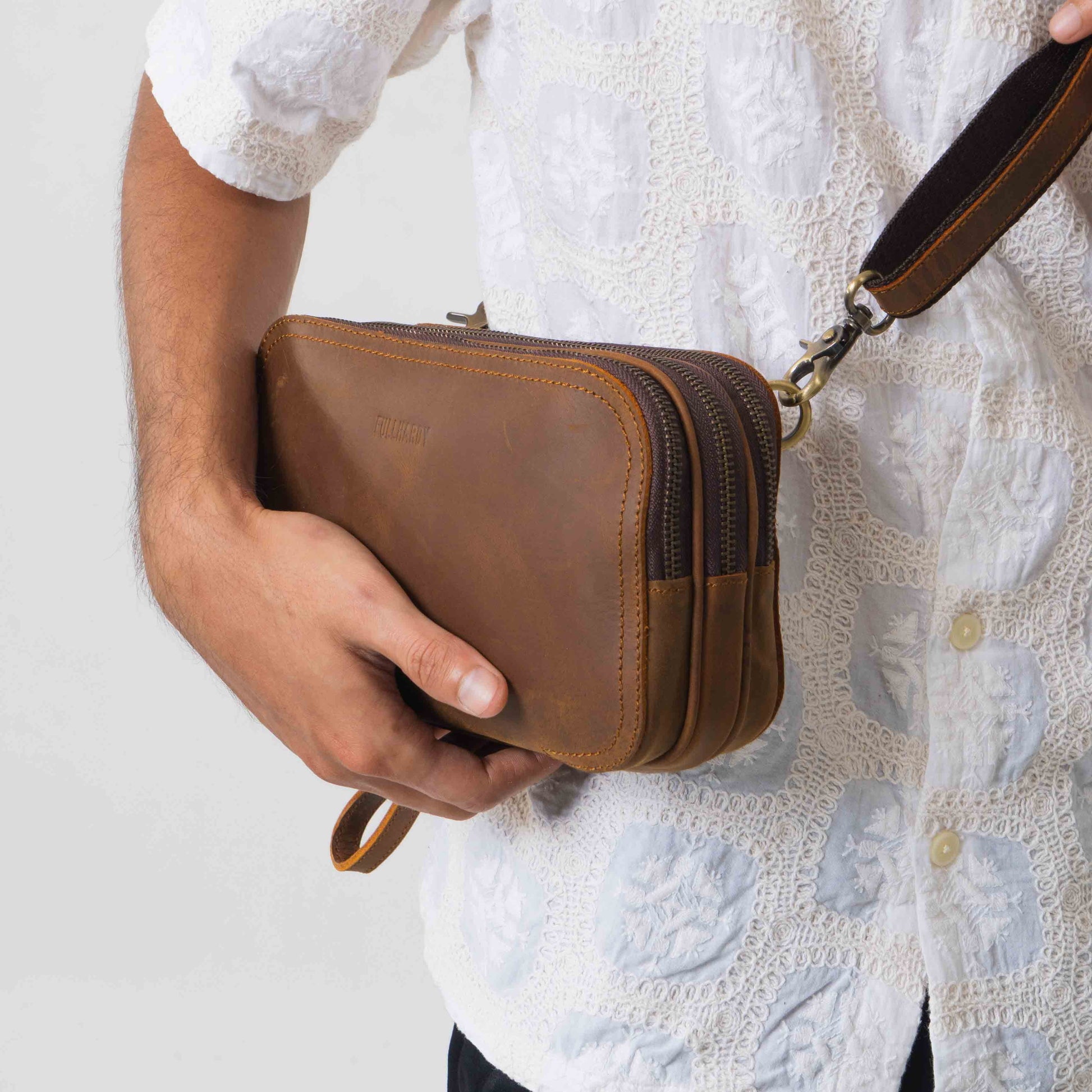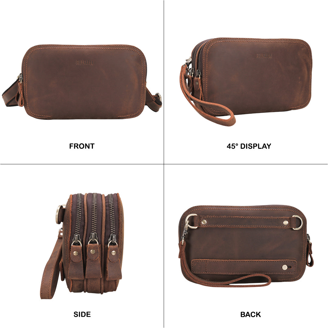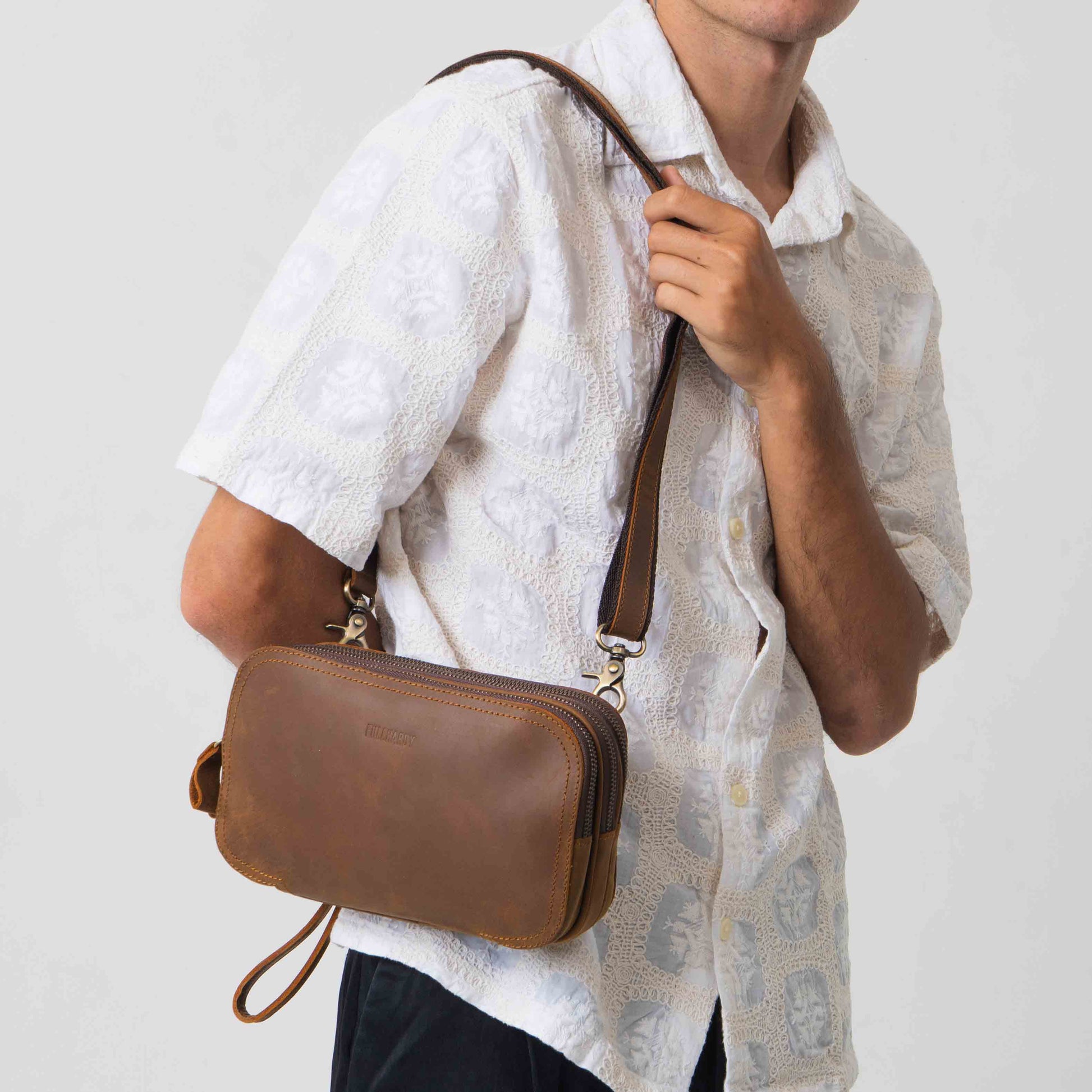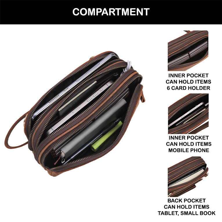 Kualitas premium dengan bahan kulit sapi yang tahan lama dan elegan. Jahitan rapi, ritsleting kokoh, serta desain klasik dengan sentuhan vintage memberikan kesan mewah. Cocok untuk membawa barang penting dengan gaya maskulin dan berkelas. Memiliki tiga ritsleting halus yang dapat memudahkan mengambil dan menyimpang barang yang terorganisir.