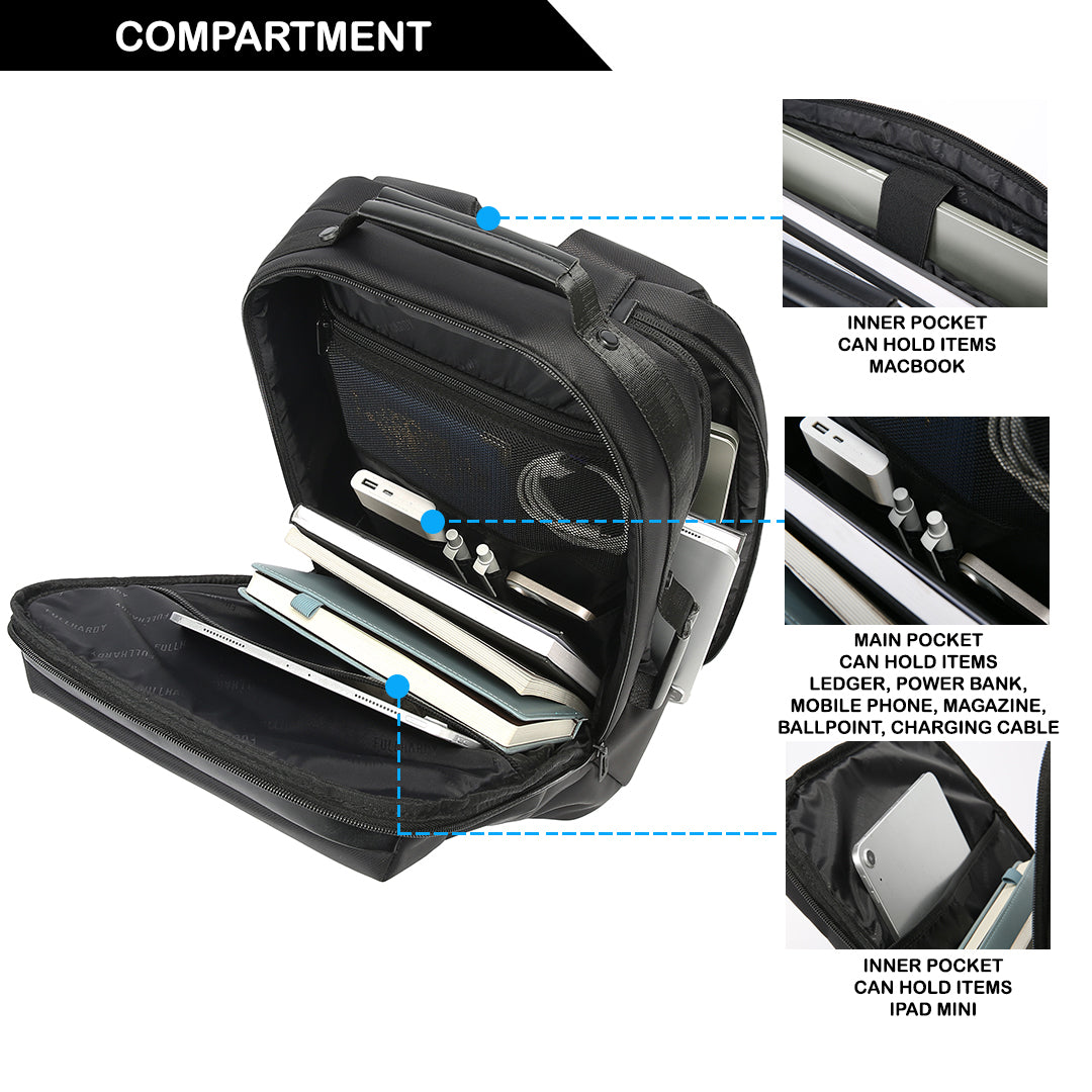 Exterior : 2 Zip Pocket, 1 USB Port, Handle Grab, Luggage Strap