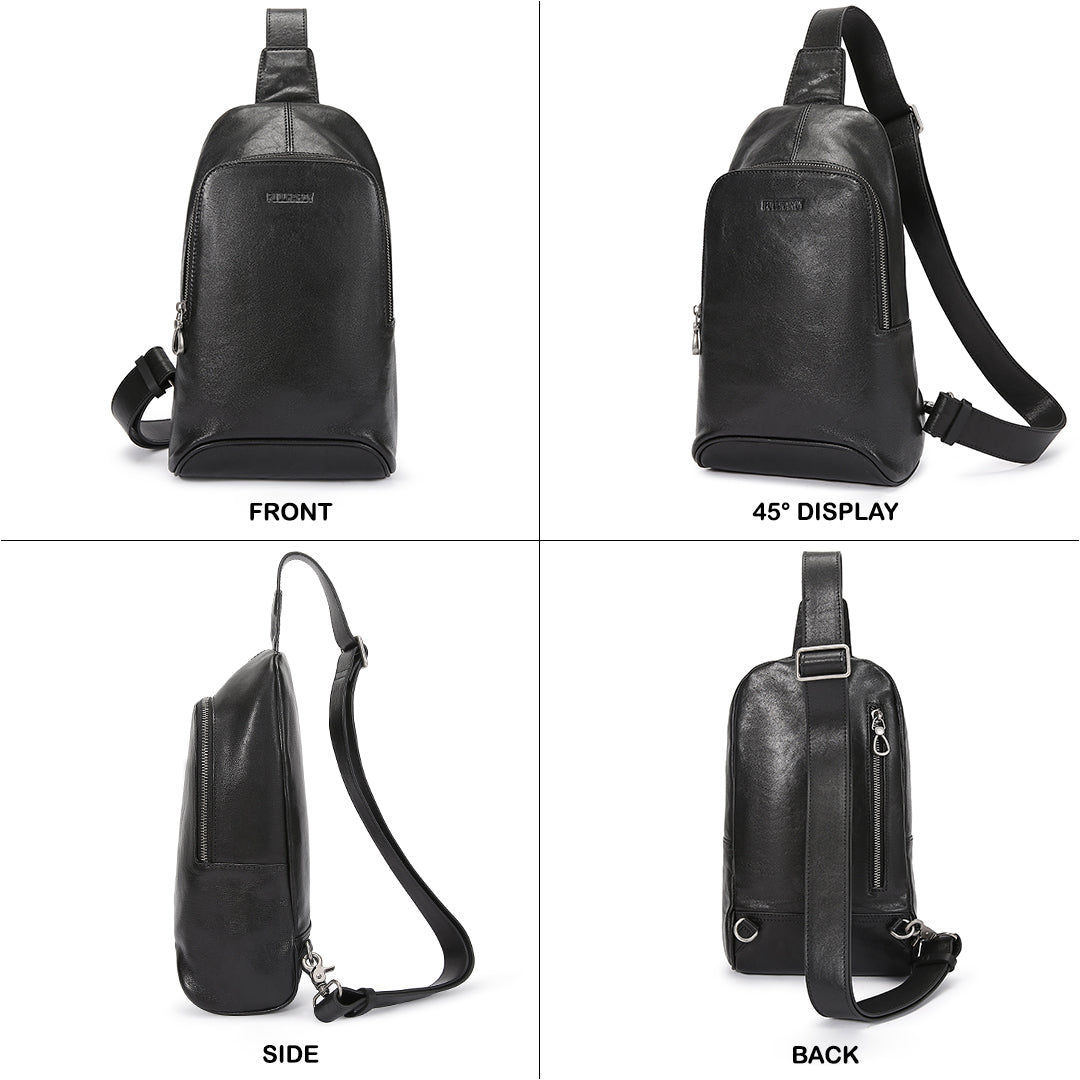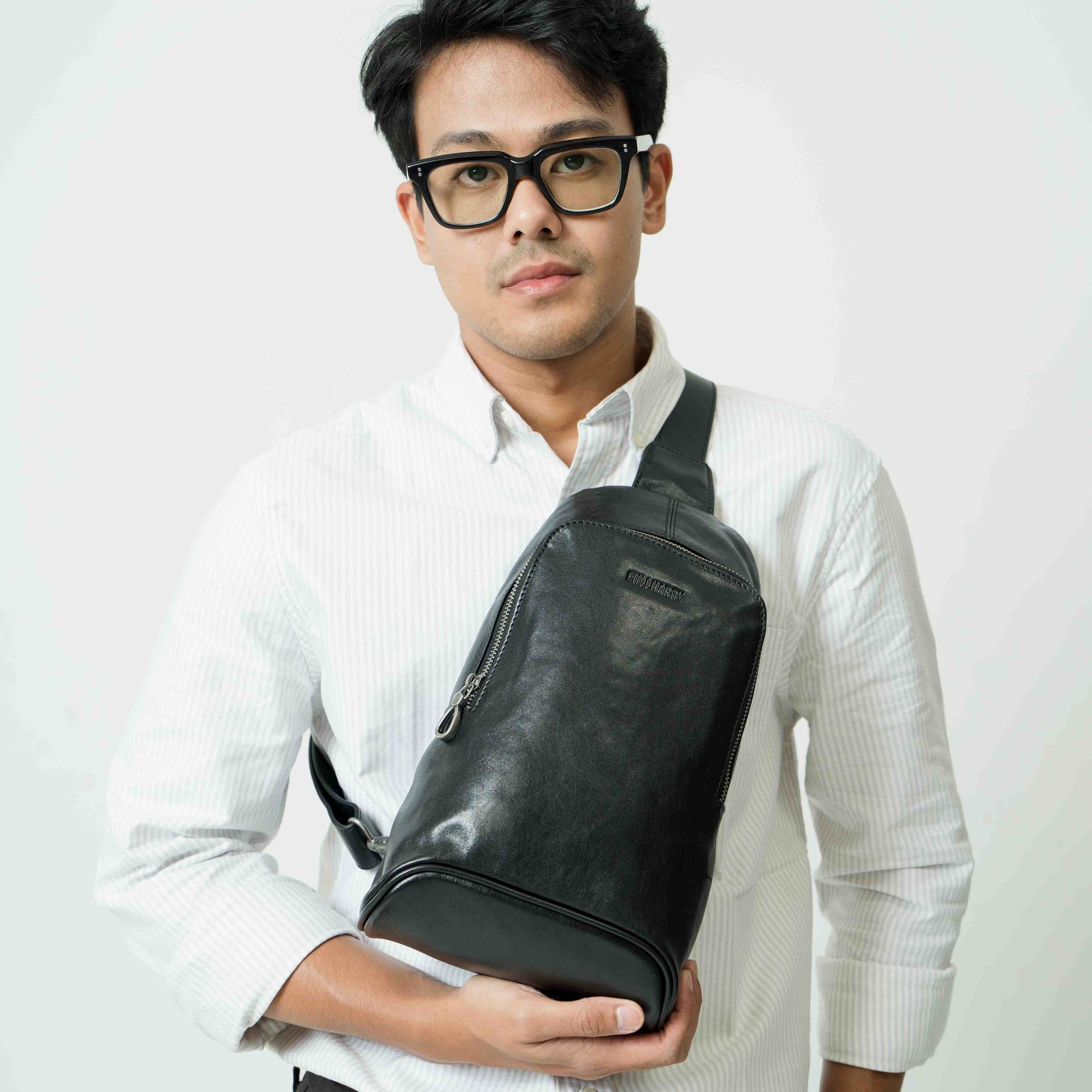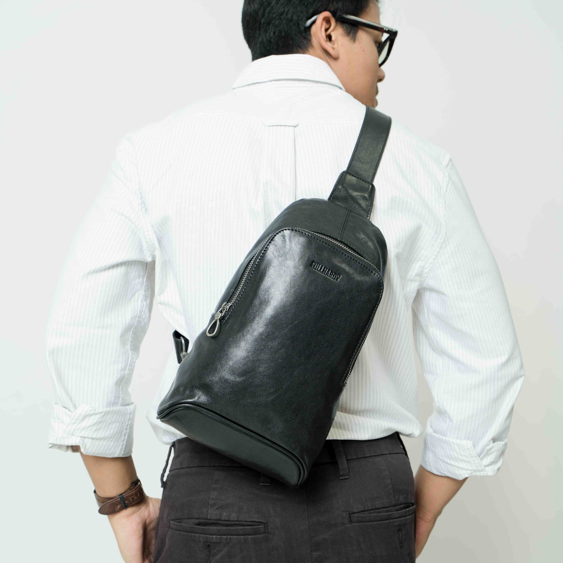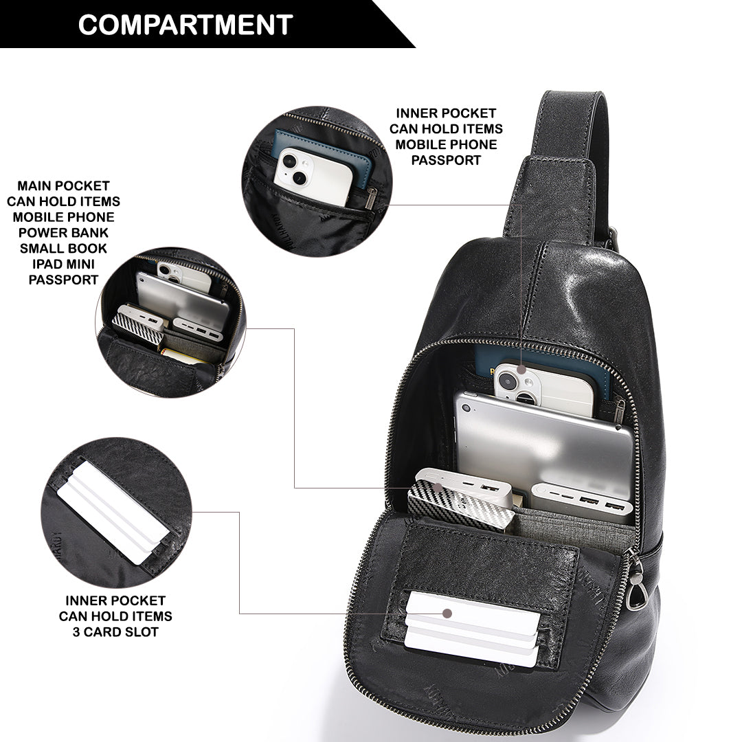 Warna hitam klasik yang memberikan kesan mewah dan maskulin. Terbuat dari bahan kulit sapi berkualitas, tas ini memiliki tekstur halus dengan sedikit kilau yang menambah tampilan premium. Strap nya bisa disesuaikan dengan kebutuhan. Dengan desain yang stylish dan fungsional, tas ini cocok untuk berbagai aktivitas, baik casual maupun formal.