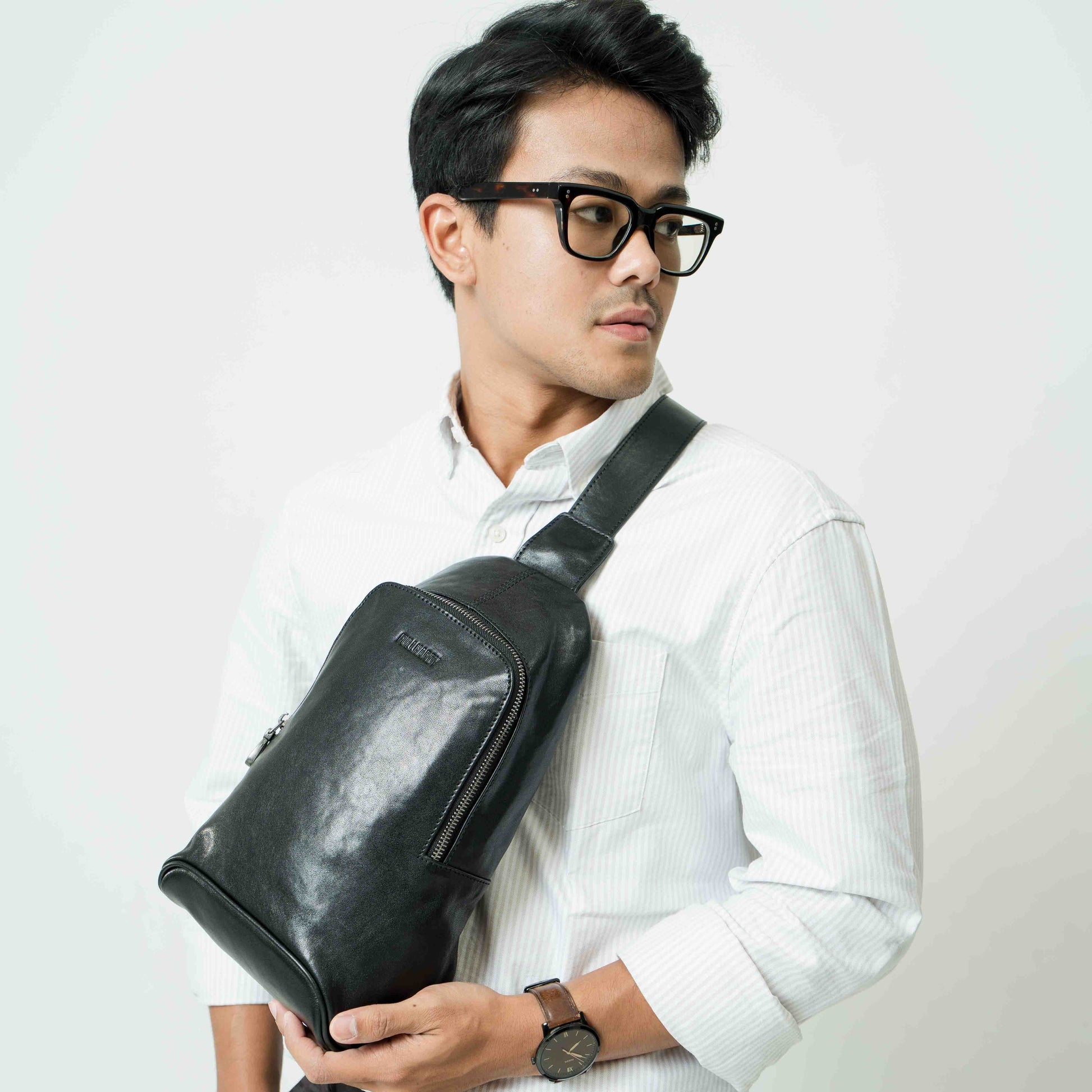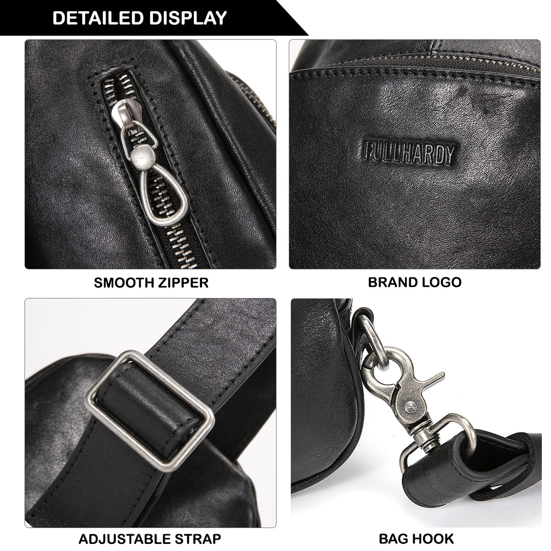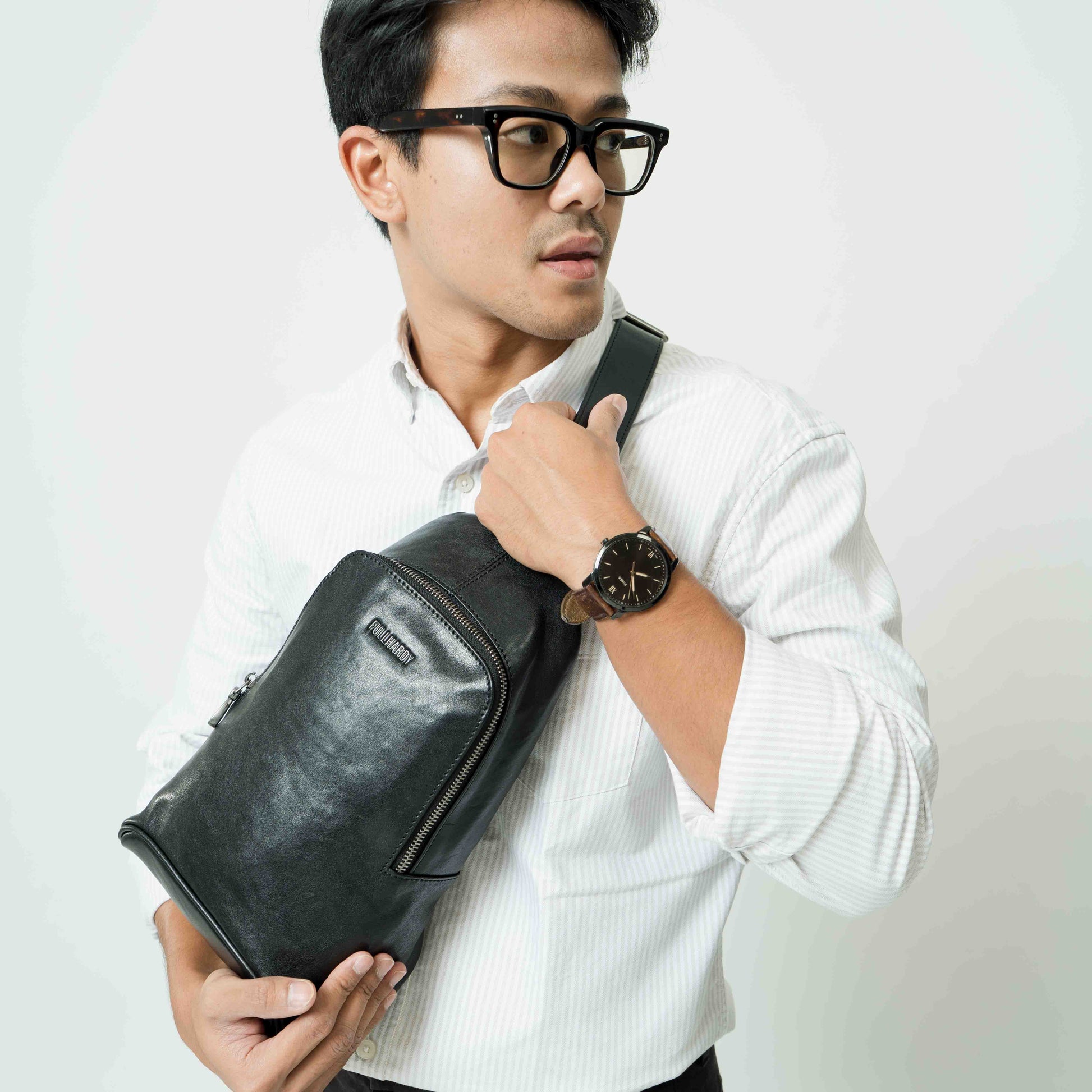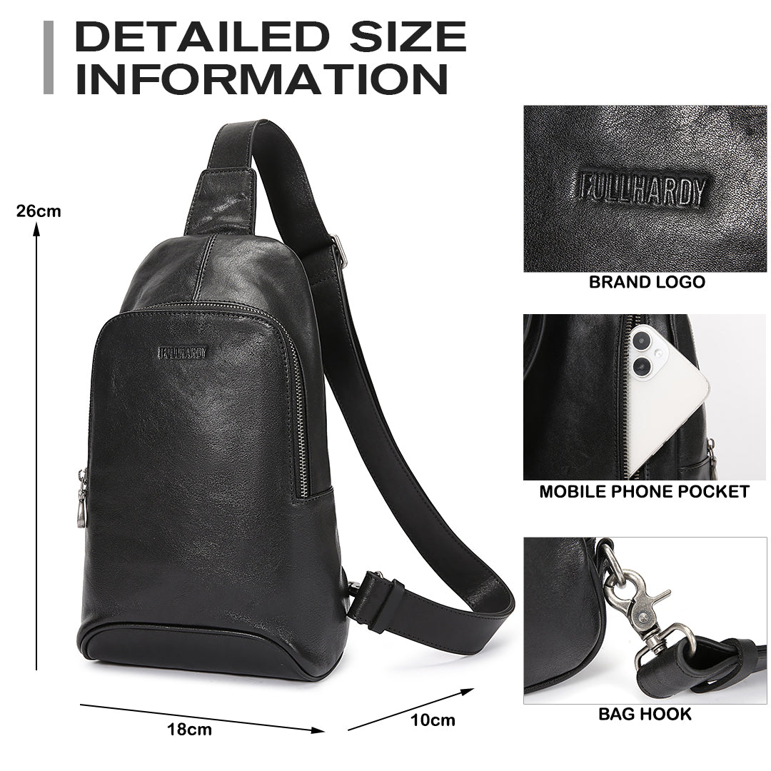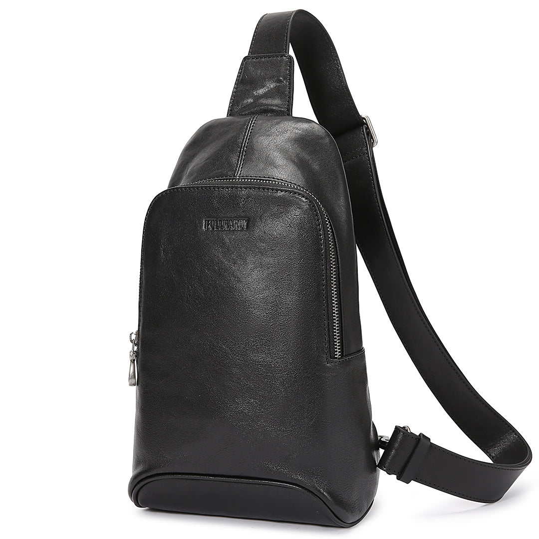 Warna hitam klasik yang memberikan kesan mewah dan maskulin. Terbuat dari bahan kulit sapi berkualitas, tas ini memiliki tekstur halus dengan sedikit kilau yang menambah tampilan premium. Strap nya bisa disesuaikan dengan kebutuhan. Dengan desain yang stylish dan fungsional, tas ini cocok untuk berbagai aktivitas, baik casual maupun formal.