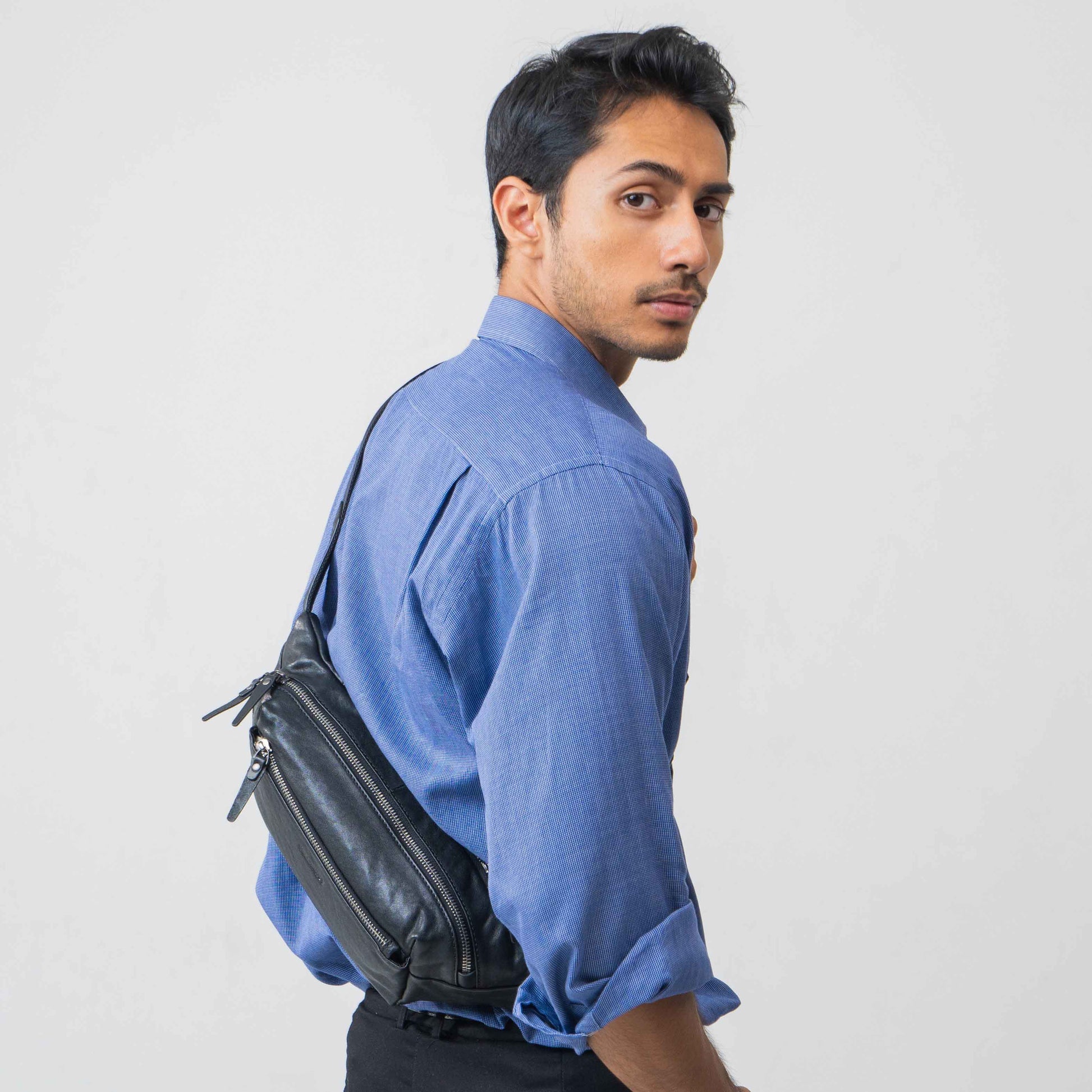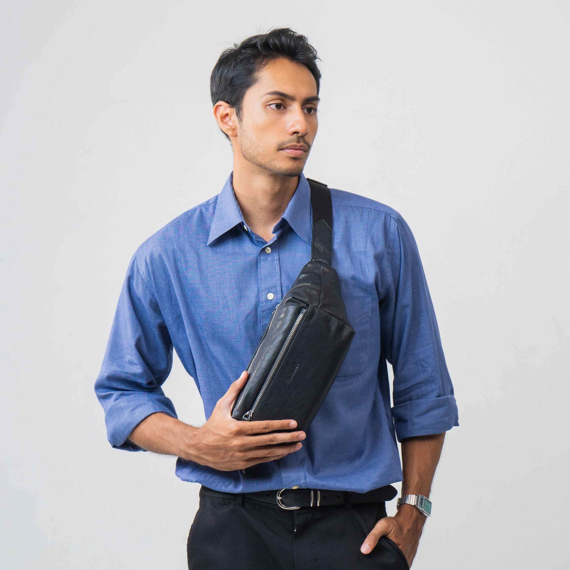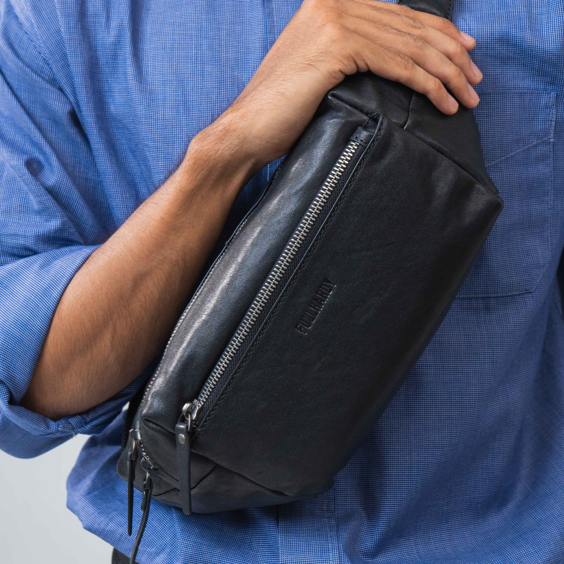 Warna hitam klasik yang memberikan kesan mewah dan maskulin. Terbuat dari bahan kulit berkualitas, tas ini memiliki tekstur halus dengan sedikit kilau yang menambah tampilan premium. Strapnya bisa disesuaikan dengan kebutuhan, memungkinkan tas ini dipakai di pinggang atau diselempangkan ke dada. Dengan desain yang stylish dan fungsional, tas ini cocok untuk berbagai aktivitas, baik santai maupun formal.