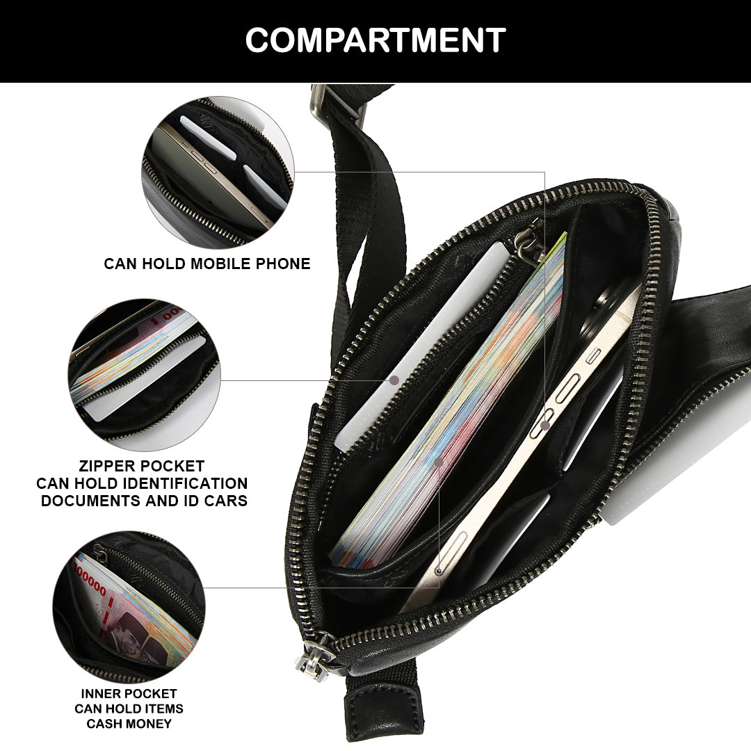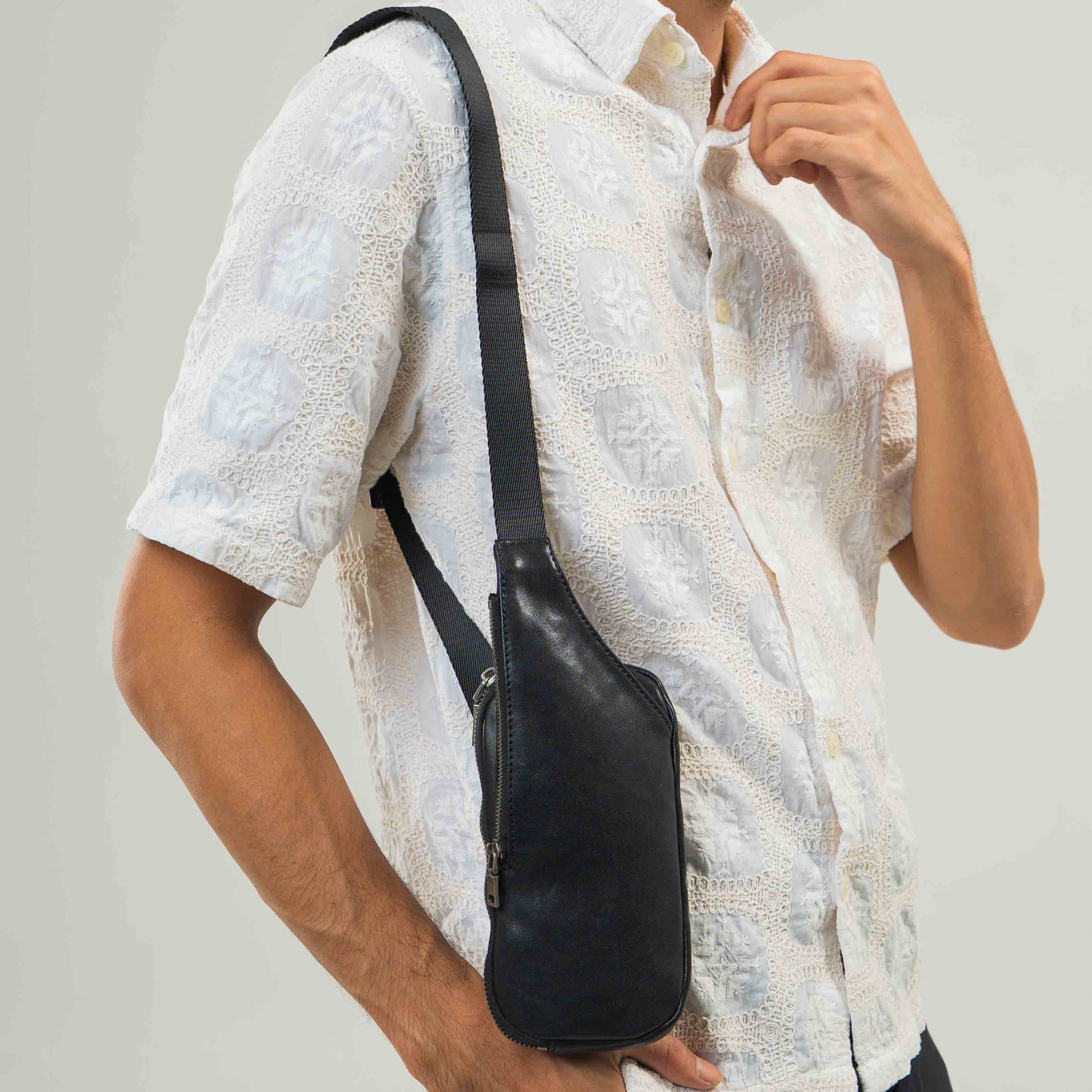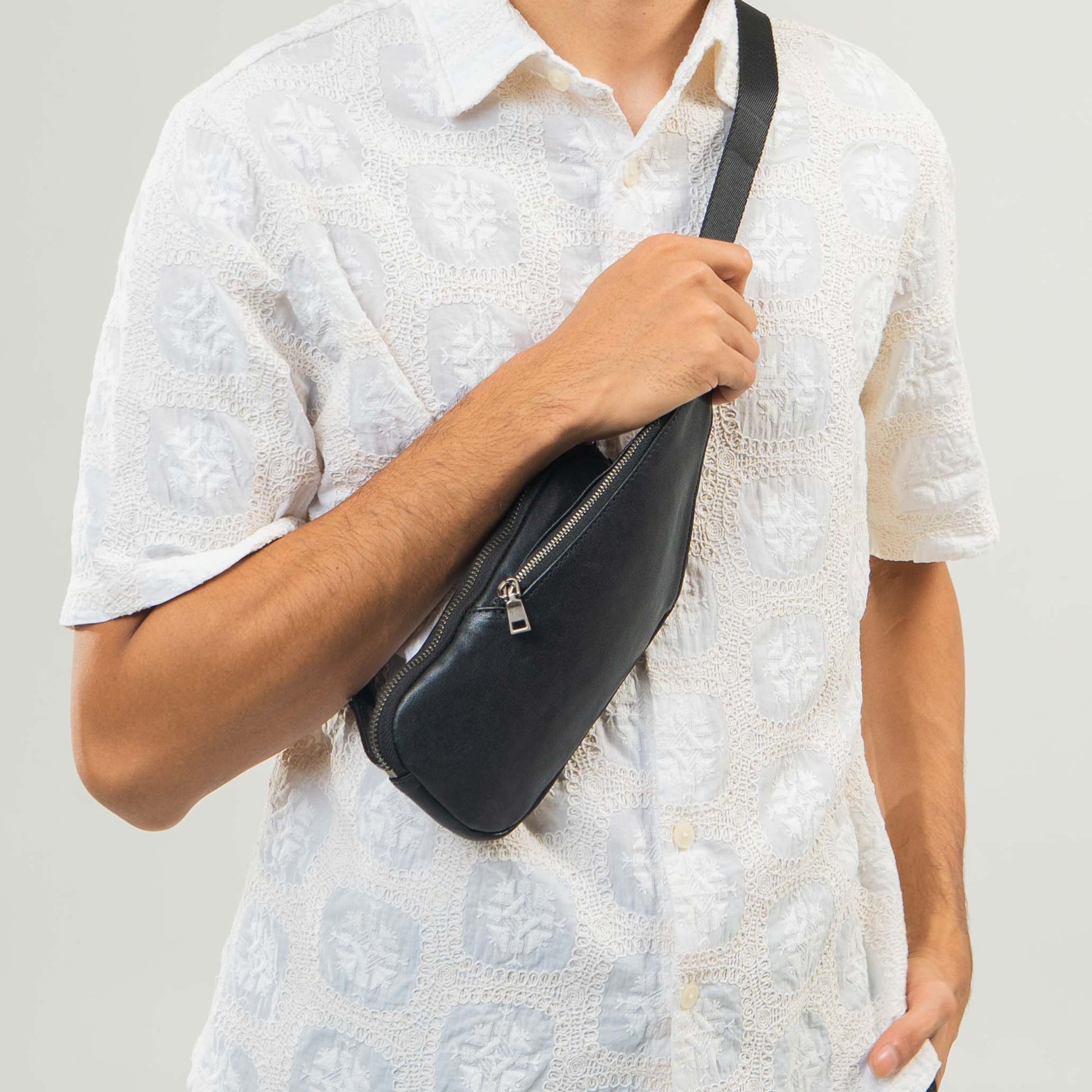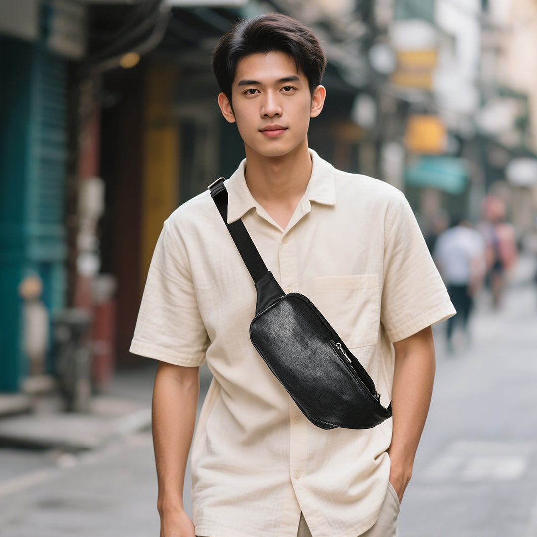 Warna hitam klasik yang memberikan kesan mewah dan maskulin. Terbuat dari bahan kulit sapi berkualitas, tas ini memiliki tekstur halus dengan sedikit kilau yang menambah tampilan premium. Strap nya bisa disesuaikan dengan kebutuhan. Dengan desain yang stylish dan fungsional, tas ini cocok untuk berbagai aktivitas, baik casual maupun formal.