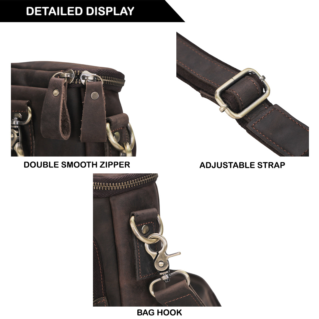 Terbuat dari kulit sapi berkualitas, dengan aksen jahitan kontras memberikan tampilan yang klasik dan elegan. Dengan ritsleting yang halus dan kokoh, memastikan keamanan barang di dalam tas. Tali bahu yang dapat disesuaikan, memberikan kenyamanan dalam penggunaan dan berbagai gaya pemakaian.