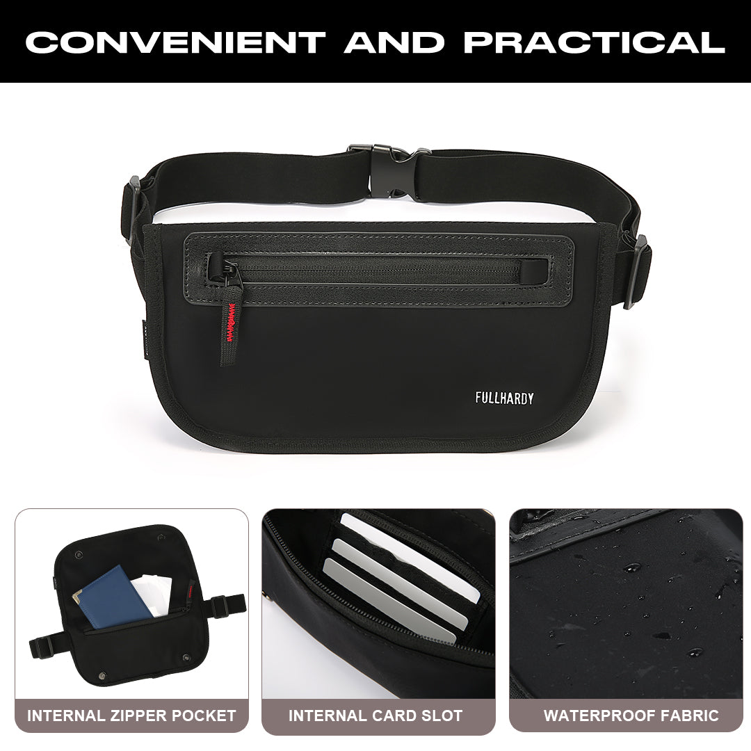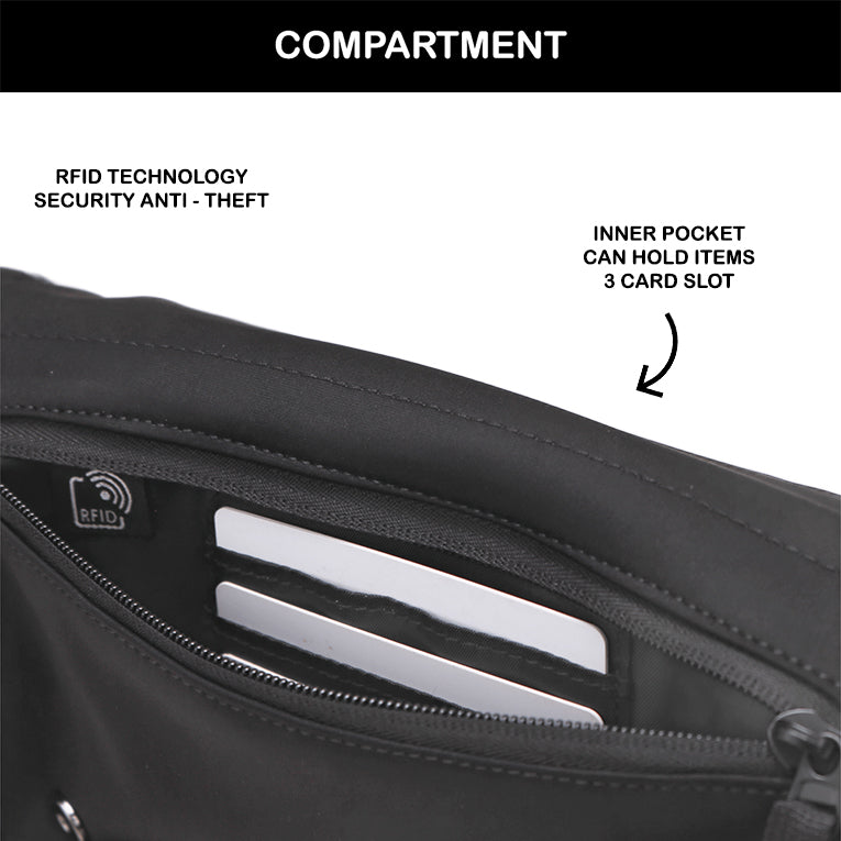 Terbuat dari bahan nylon berkualitas yang memberikan tampilan mewah serta daya tahan yang baik. Dilengkapi dengan zipper yang kokoh untuk memastikan keamanan barang di dalamnya aman. Terdapat kantong depan dan belakang agar memudahkan mengambil atau menyimpan barang dengan cepat. Memiliki teknologi penghalang RFID Radio Frequency Identification, yang membantu melindungi informasi pribadi anda dari pencurian data digital. Cocok untuk perjalanan, aktivitas sehari-hari, atau sekadar tampil lebih rapi dan stylish.