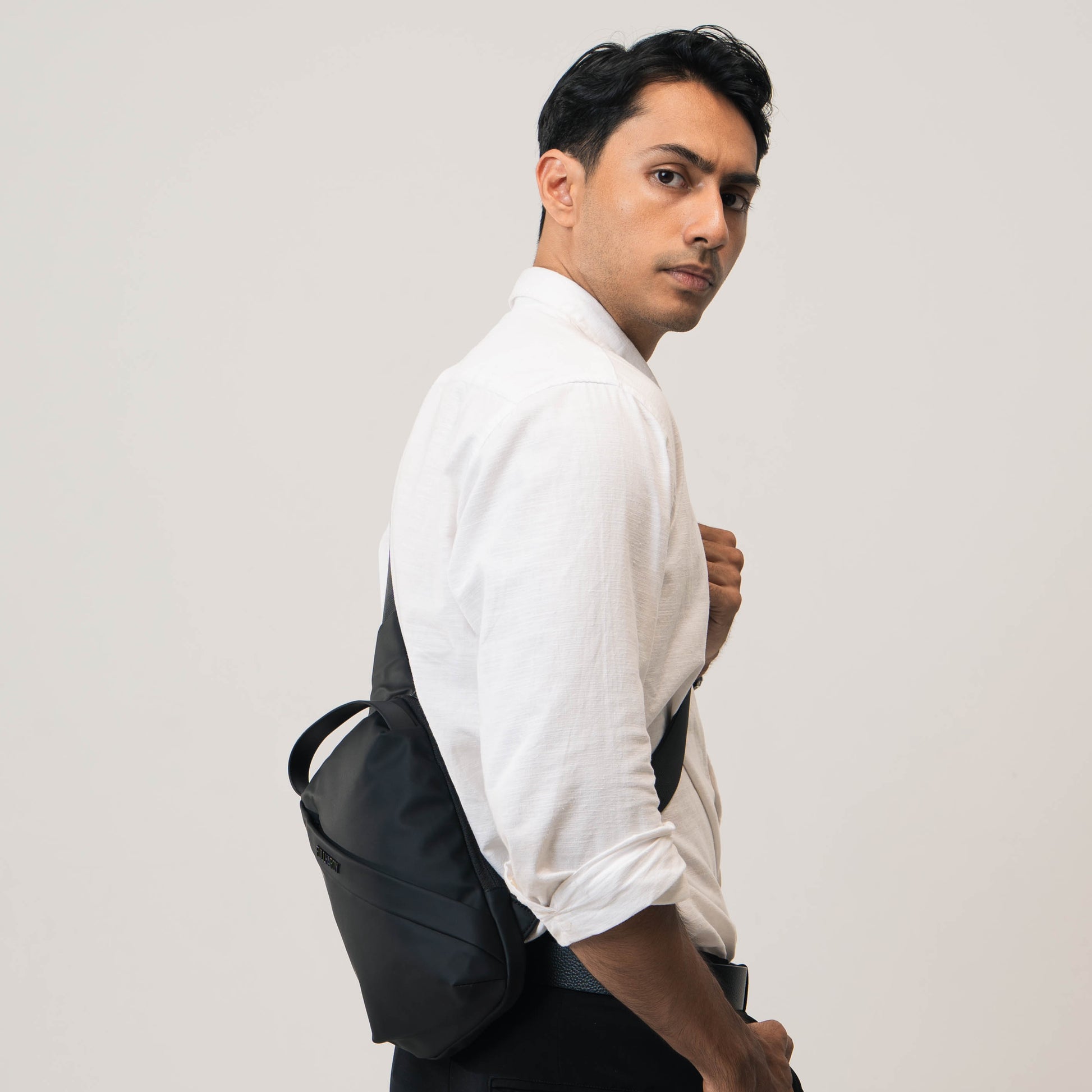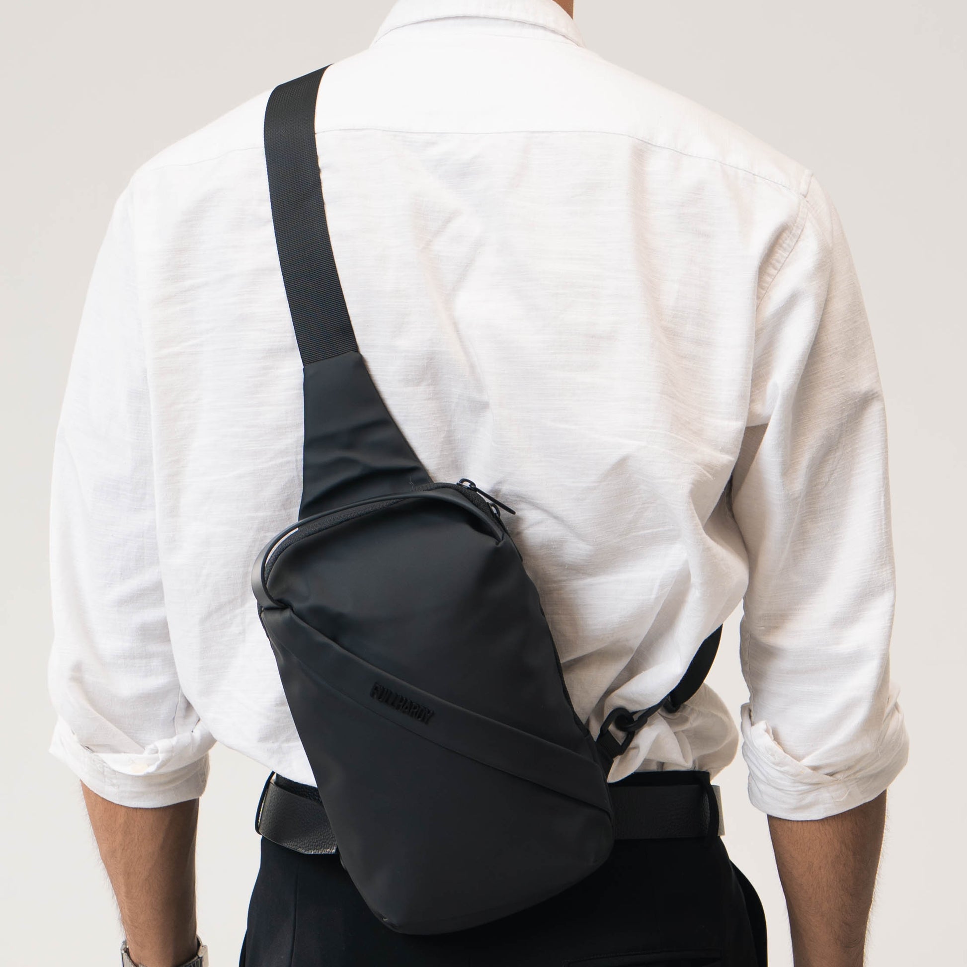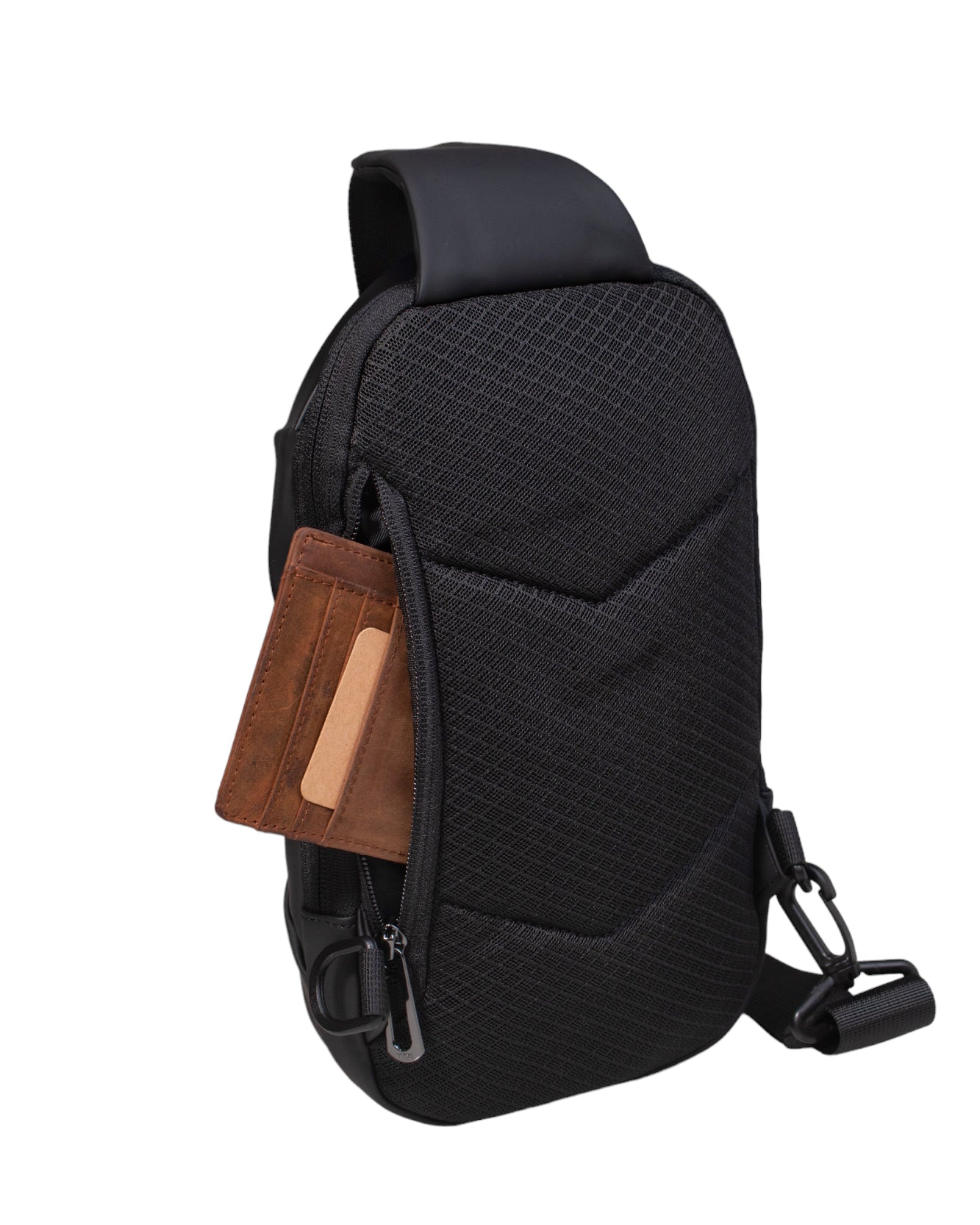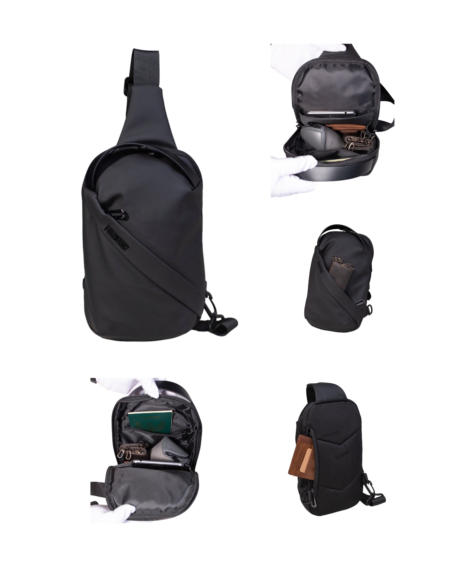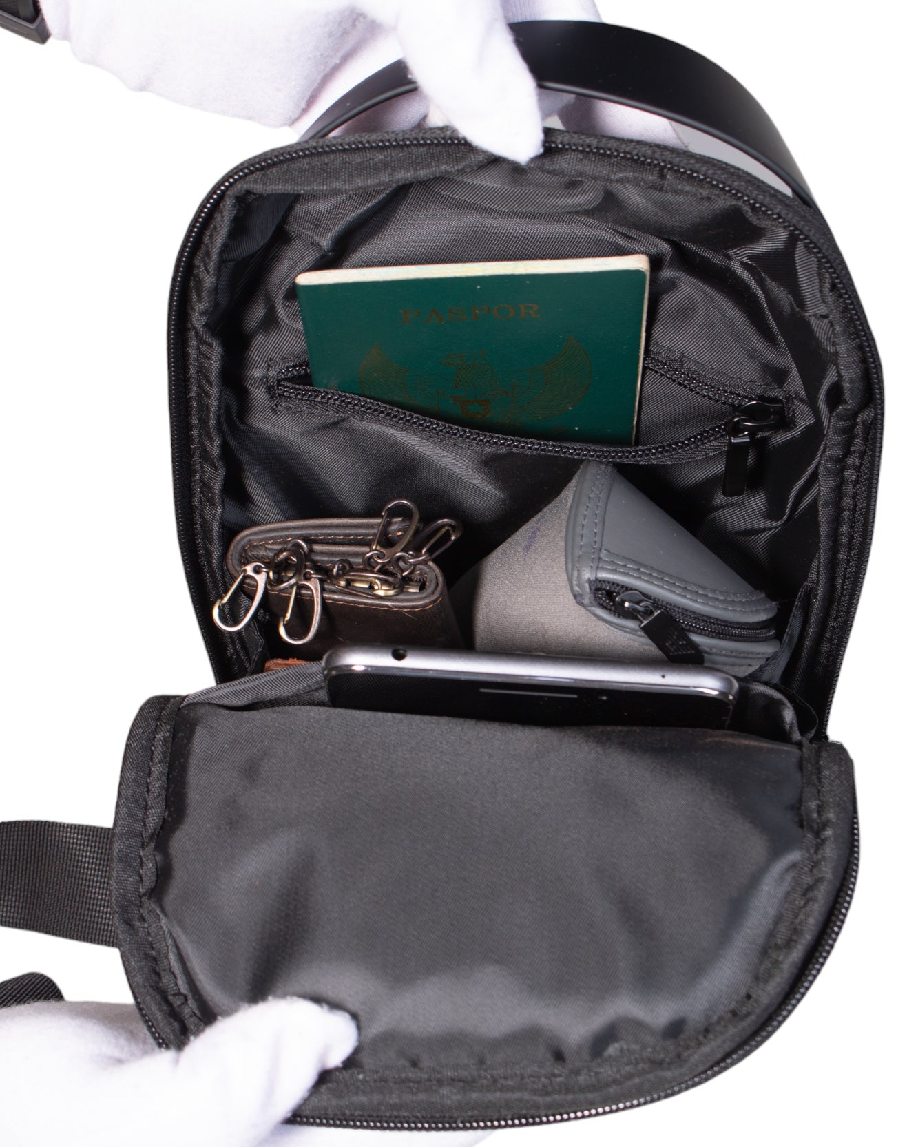 Tas ini memiliki desain modern dan minimalis, didominasi oleh warna hitam yang elegan. Terbuat dari bahan polyester berkualitas yang tahan air, memberikan perlindungan ekstra untuk barang-barang di dalamnya. Terdapat 1 kantong depan dan 1 kanton belakang untuk akses mudah yang strategis untuk menyimpan barang penting.