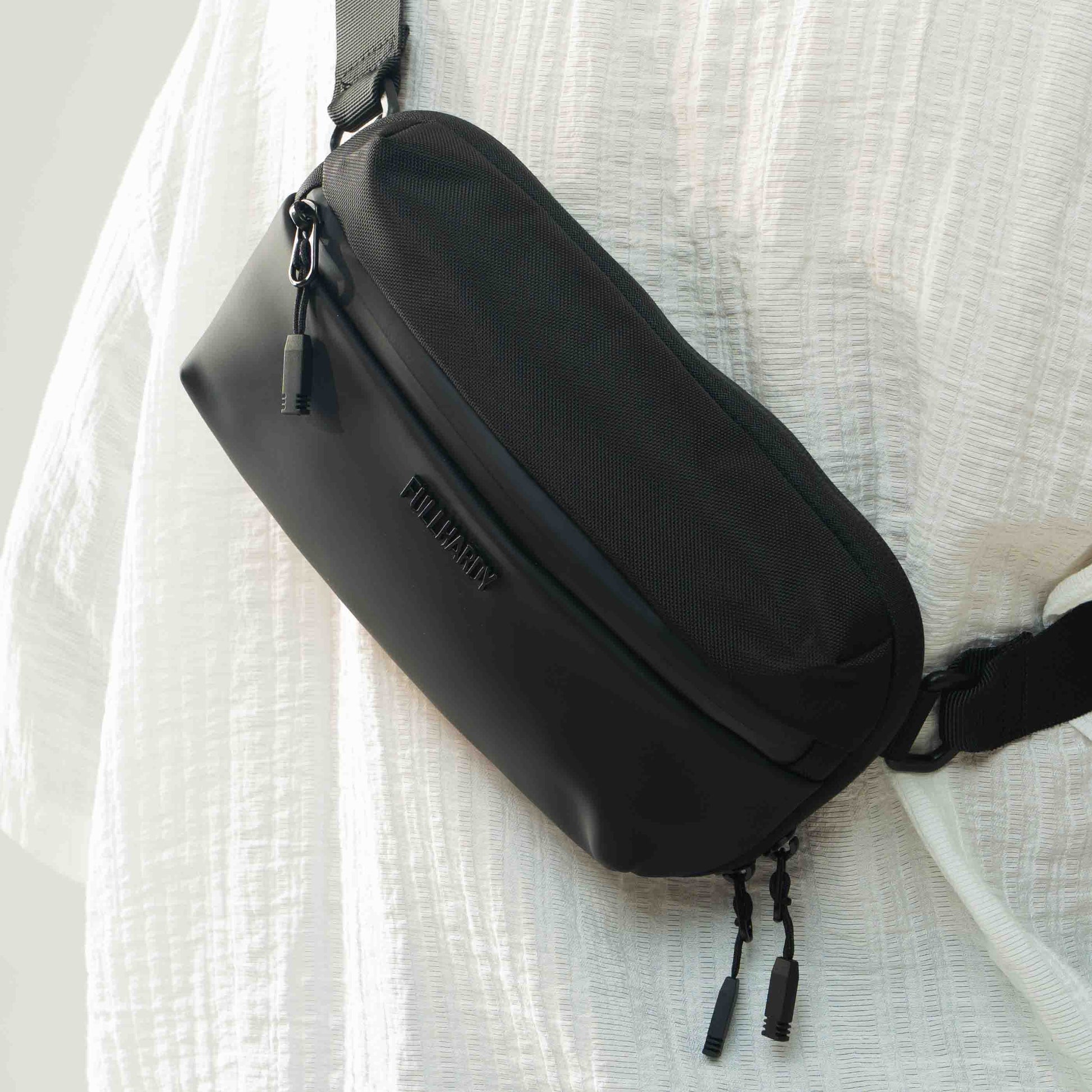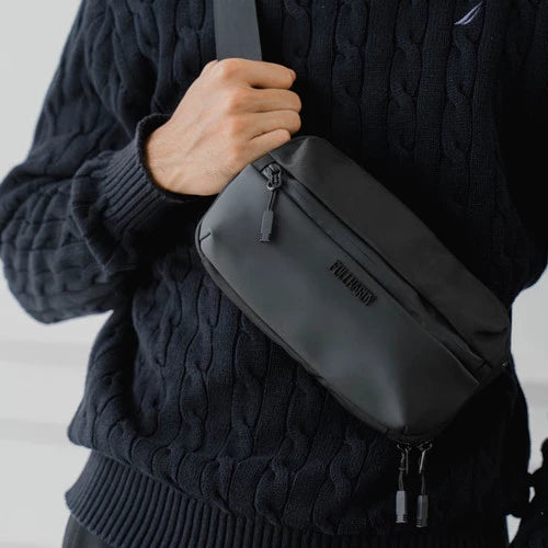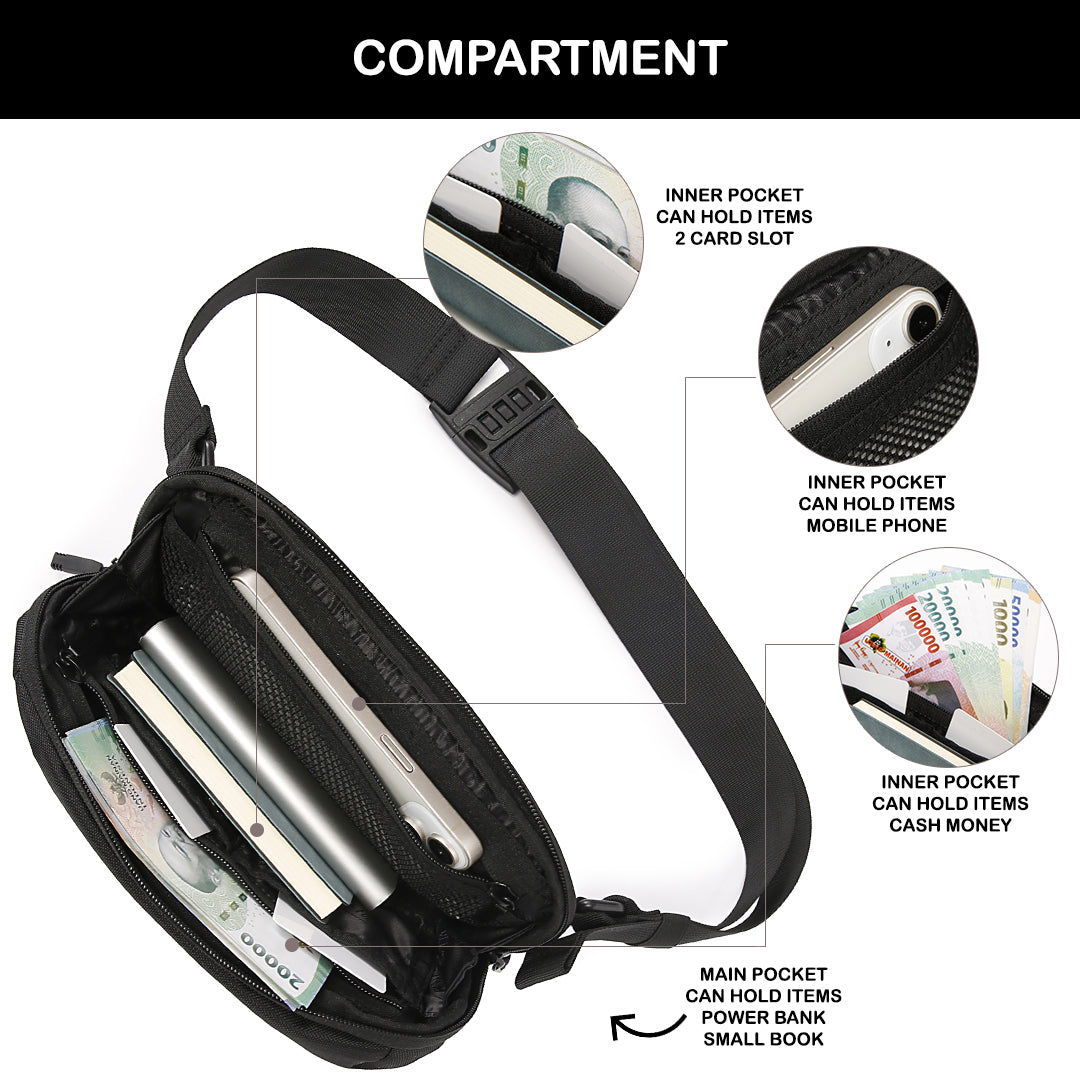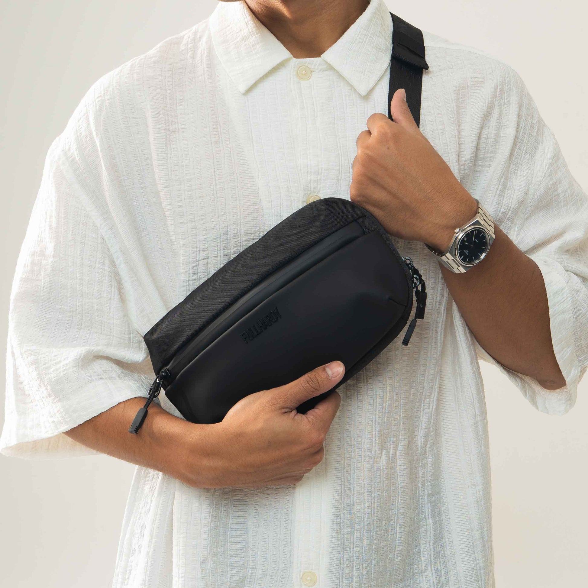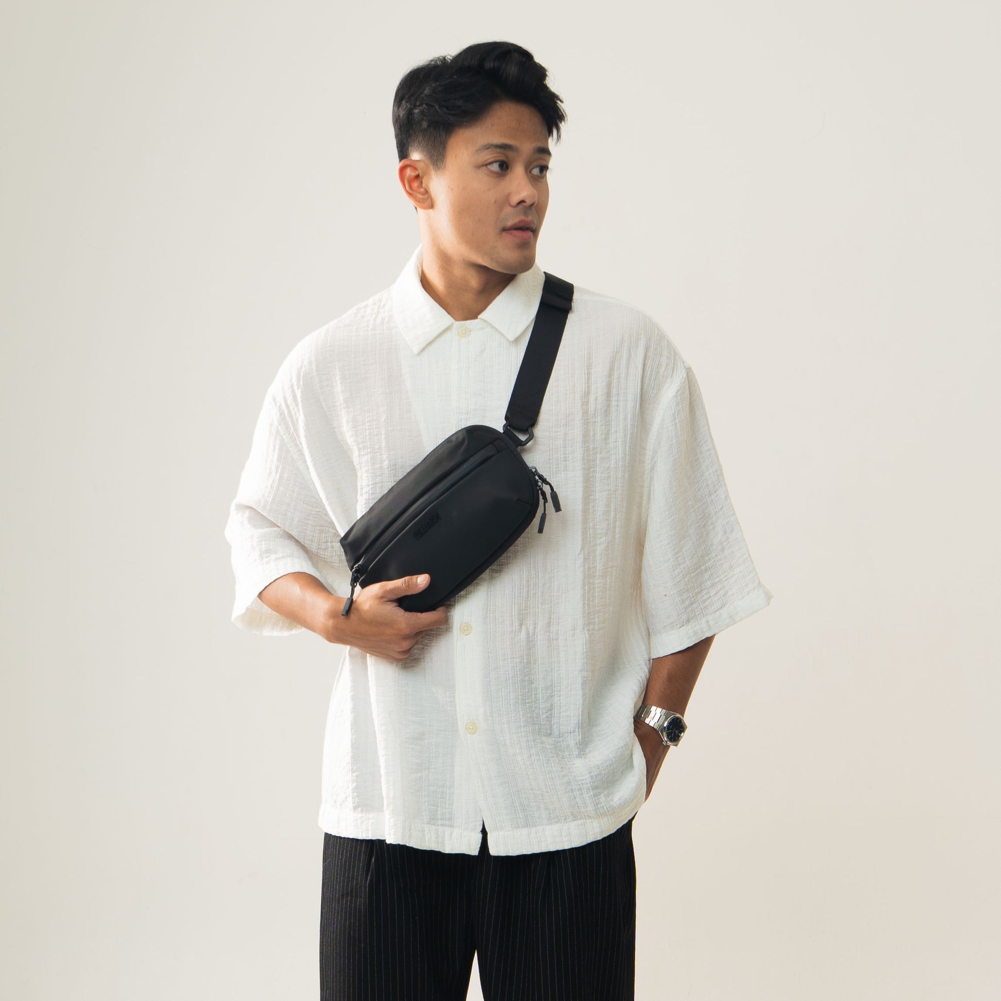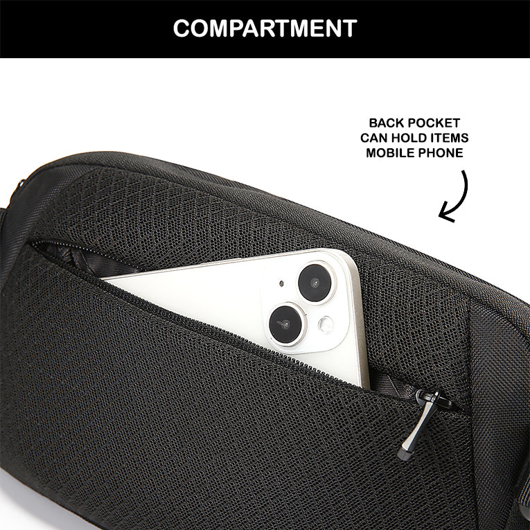 Berwarna hitam elegan dengan bentuk yang futuristik, terlihat kokoh dan stylish. menggunakan bahan tahan air atau water-resistant, cocok untuk aktivitas luar ruangan. Memiliki kompartemen utama yang cukup untuk membawa barang sehari-hari dan 1 kantong di bagian depan untuk akses mudah mengambil atau menyimpan barang. Secara keseluruhan, tas ini memancarkan kesan simpel, fungsional, dan berkelas cocok buat yang suka tampil keren tanpa usaha berlebihan.