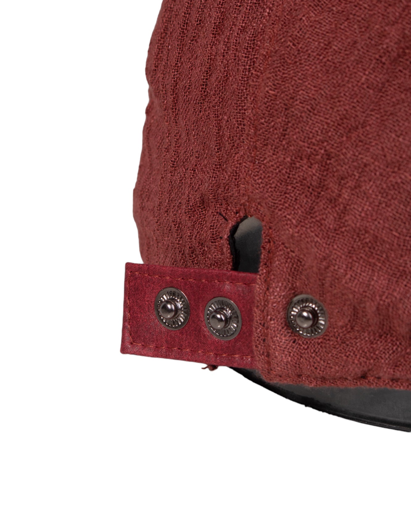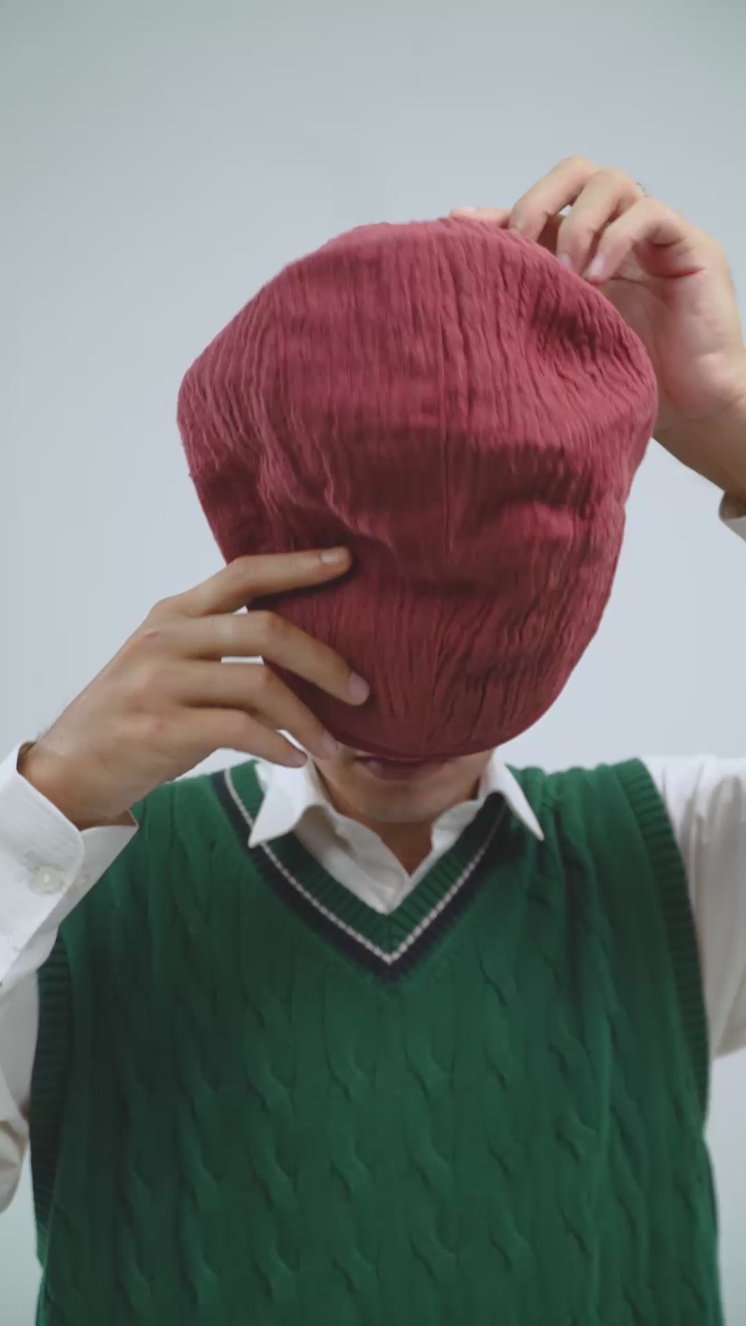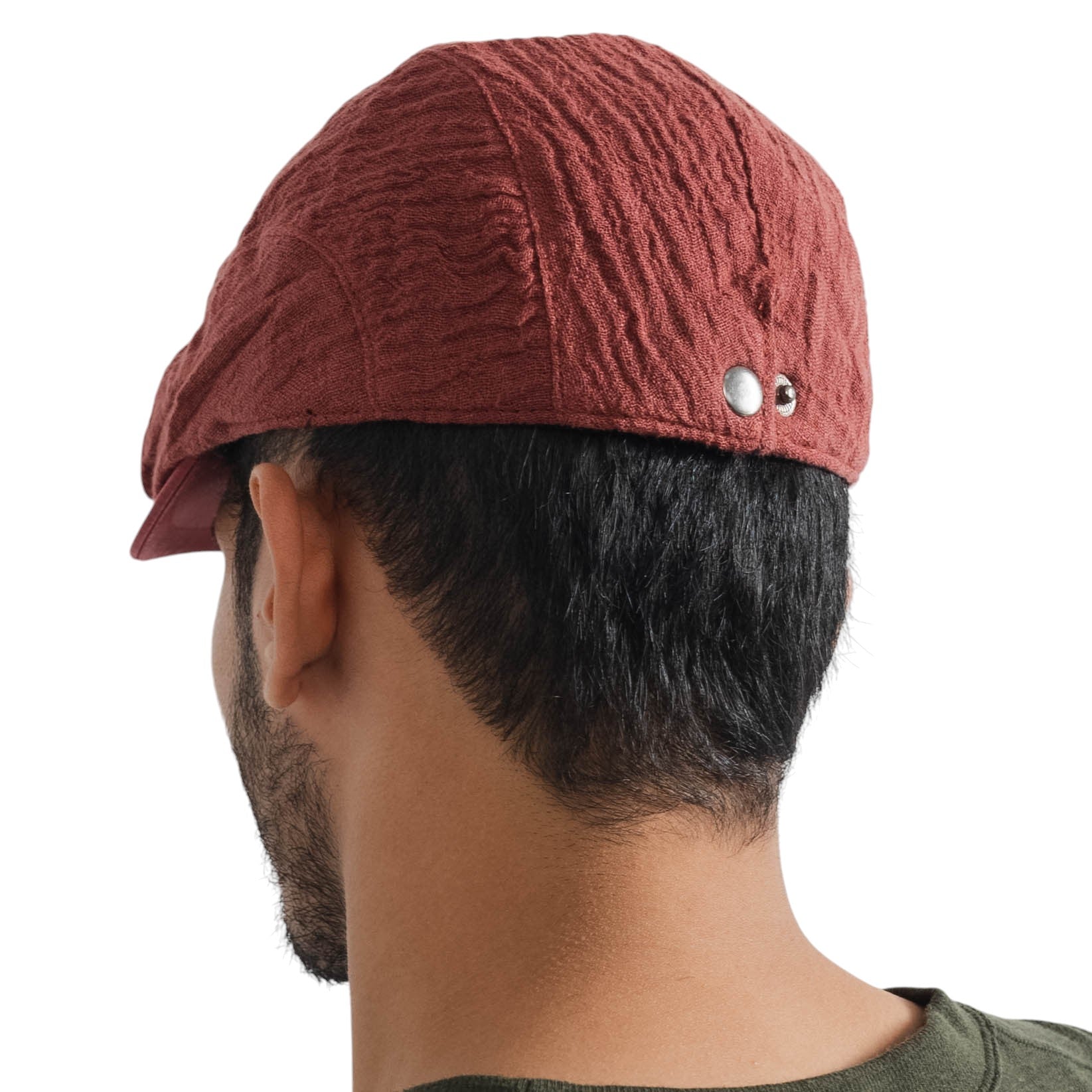 Berbentuk klasik dengan desain mirip topi newsboy atau flat cap. memiliki tekstur kasar, memberikan kesan alami dan organik. Ada penutup snap button yang berfungsi untuk penyesuaian, dengan detail logam yang menambah elemen gaya pada desain keseluruhan. Cocok untuk penggunaan sehari-hari atau acara informal, memberikan kesan yang trendi dan santai. Dengan desain tersebut, topi ini tidak hanya berfungsi untuk melindungi dari panas tetapi juga menambah karakter pada penampilan pemakainya.